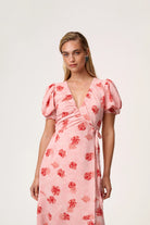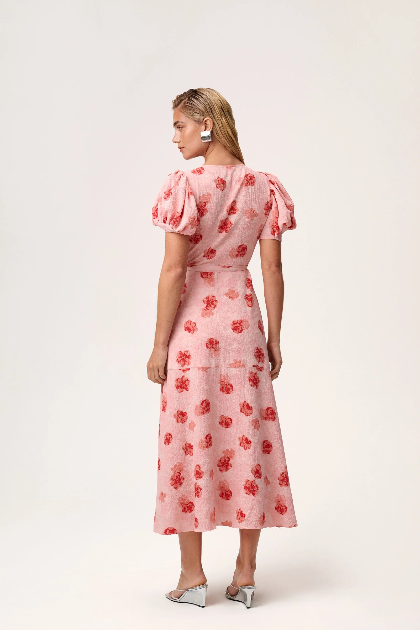 midikjole i rosa blomstertrykk. Denne kjolen har et omslagsbånd for en skreddersydd passform, puffermer og en klokkeformet bunn for ekstra stil. Kjolen er helfôret.