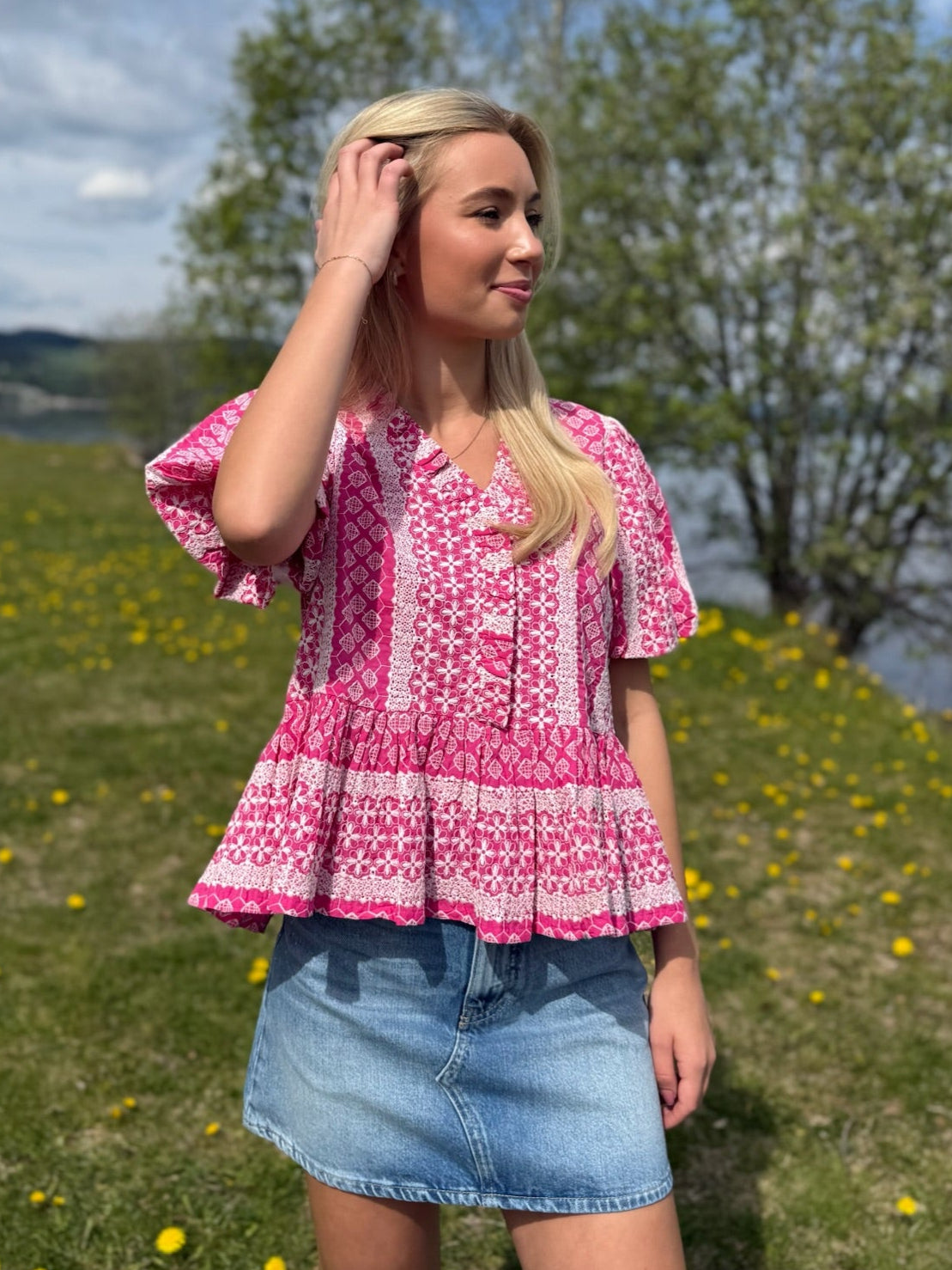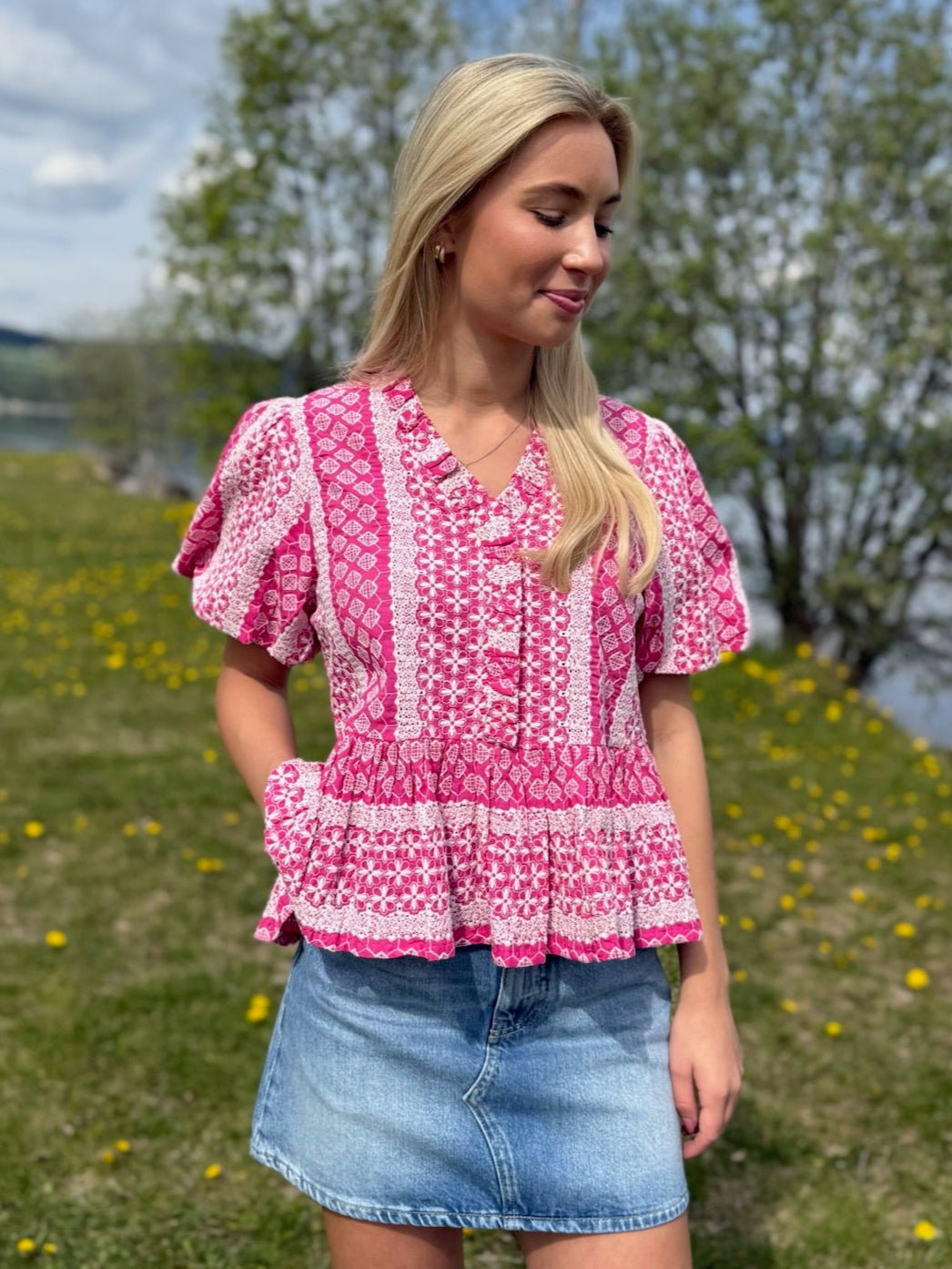 Lorraine Blouse i fargen Pink Sugar fra Noella er en feminin bluse med et friskt og sommerlig mønster i rosa og hvite nyanser. Blusen har korte puffede ermer, liten ståkrage og dekorative knapper i front. Den markerte midjen og det lett utsvingte peplum-snittet gir en flatterende og leken silhuett. Perfekt å style med både jeans, linbukser eller skjørt – enten du skal på jobb, kafébesøk eller sommerfest. Et nydelig plagg som kombinerer komfort med et romantisk uttrykk.