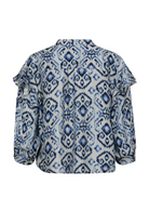 Sommerlig og elegant. Denne lette blusen er laget i en skinnende kvalitet med et vakkert print som oser av varme dager. De delikate volangdetaljene ved skuldrene og de 3/4 lange ermene gir et feminint og sofistikert uttrykk, perfekt både til hverdags og festlige anledninger.