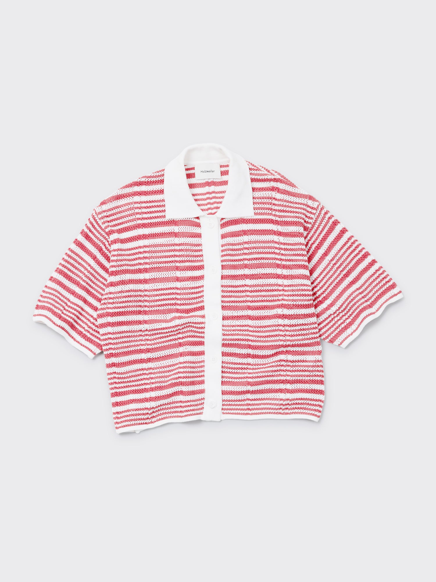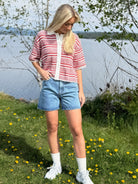 Kelp Striped Shirt har en beskåret silhuett og er laget av en komfortabel heklestrikk. Den har en klassisk krage, knapp foran og korte ermer.