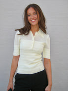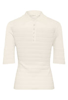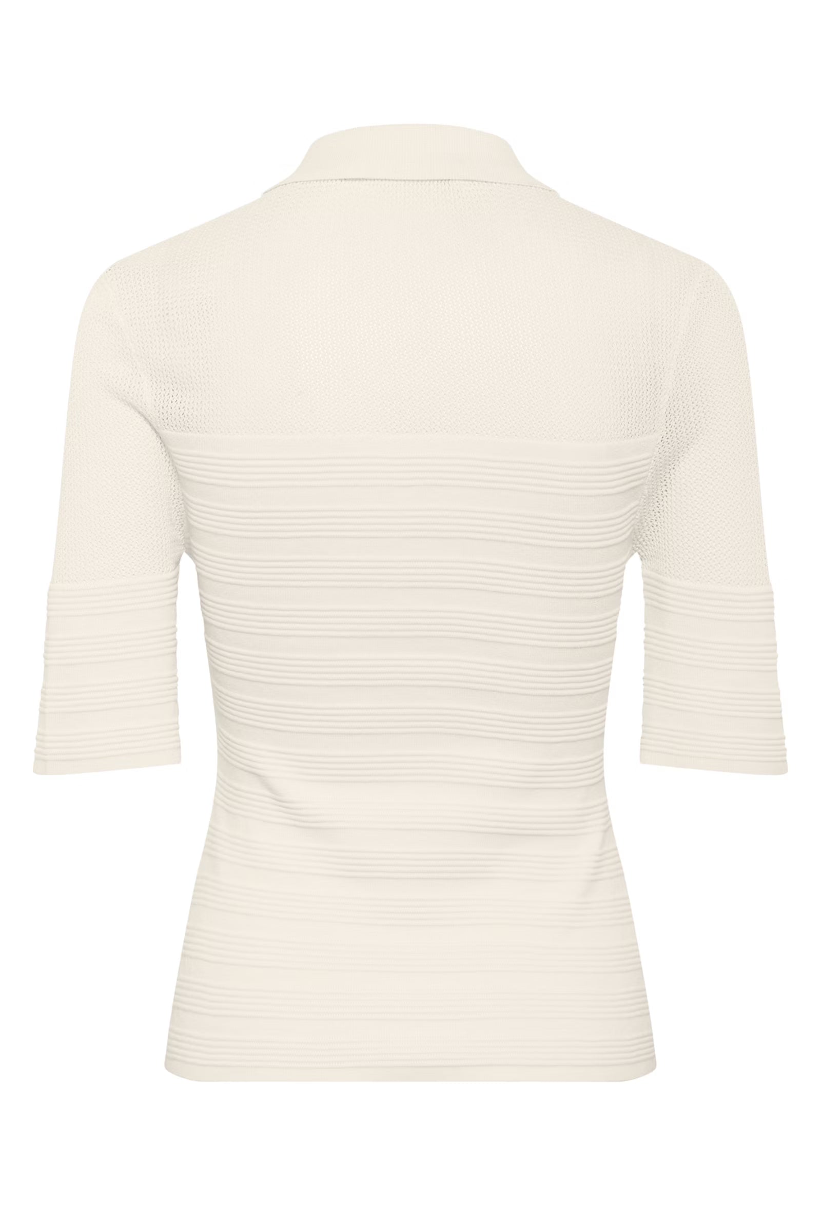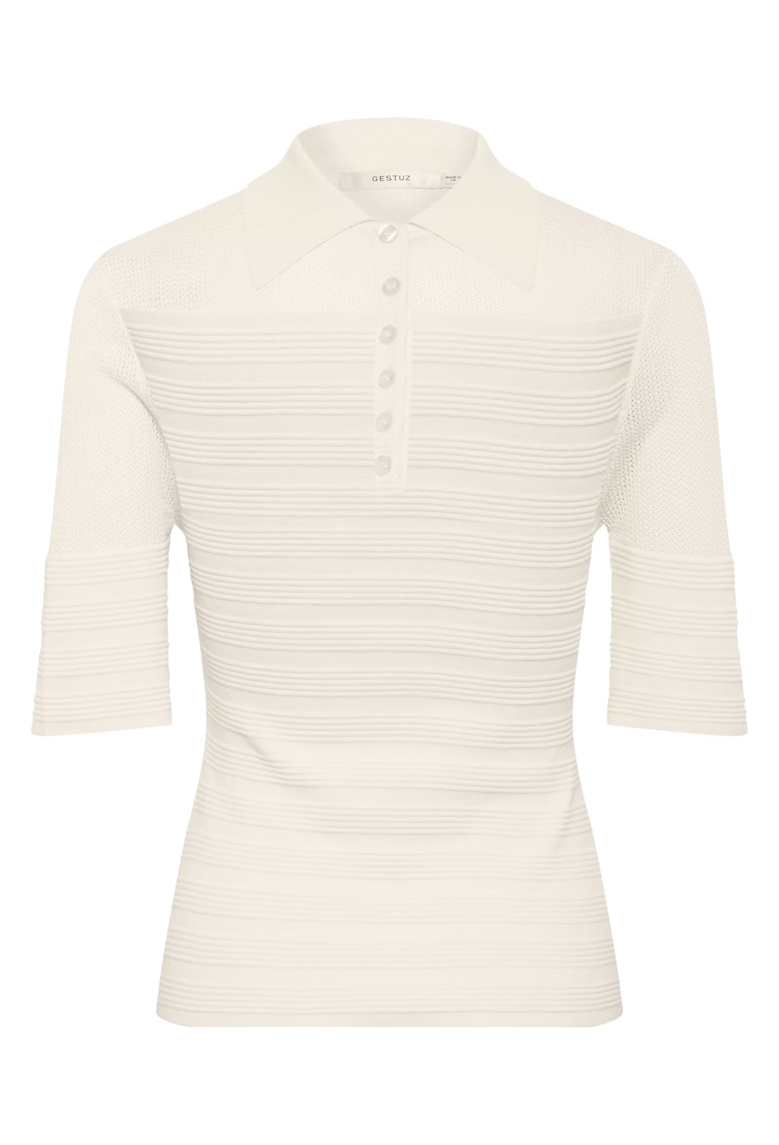 GZMagny Top er en tettsittende strikket topp med polokrage, knappestolpe og albuelange ermer. Overdelen er designet med gjennomsiktige paneler over skuldrene og ermene for et moderne, teksturert uttrykk.