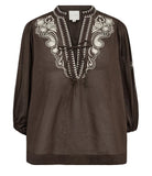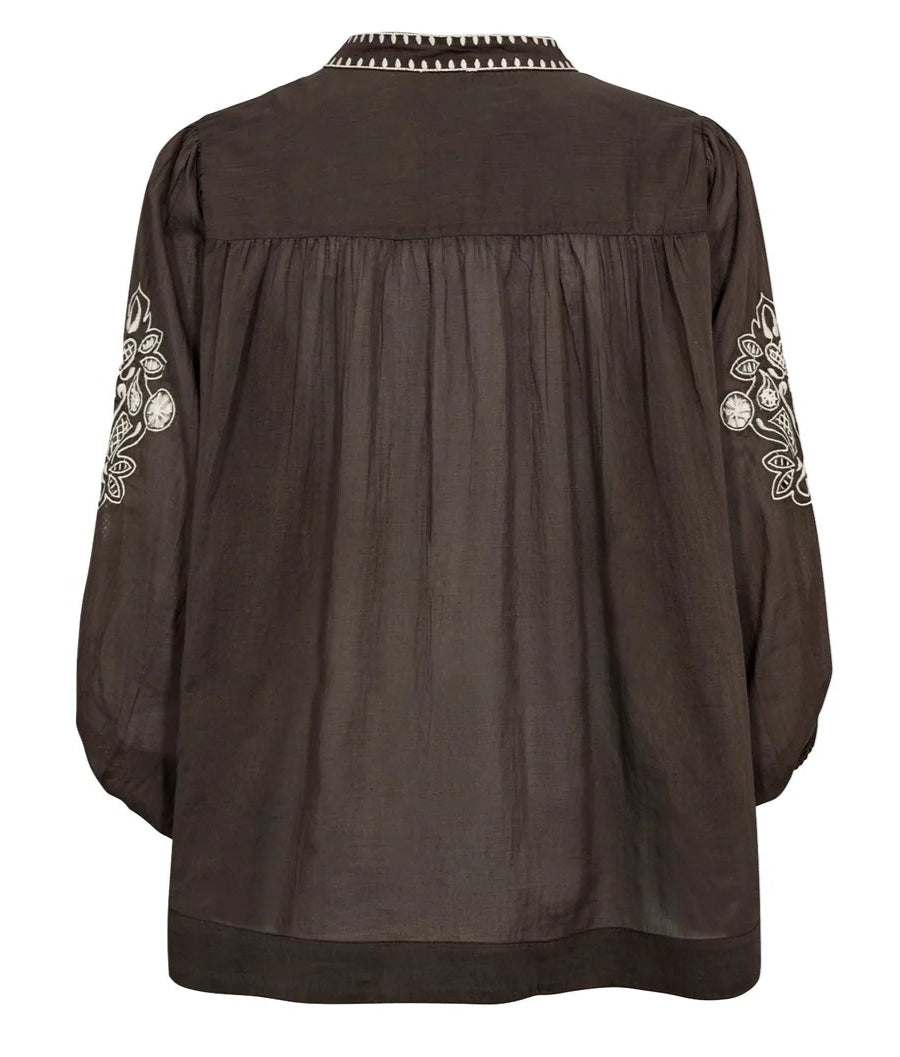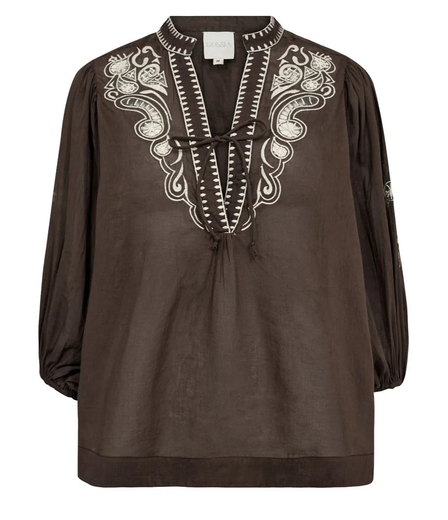 NouraGO fra Gossia er en fantastisk lett og behagelig bluse laget i myk, tynn bomullskvalitet med de vakreste broderidetaljene. Den har smale skuldre og en løs, avslappet passform som gir et feminint og luftig uttrykk. Blusen har 3/4-lange ermer med elastikk ved mansjettene, og en dyp V-utringning med dekorativt knytebånd i front. Perfekt til både hverdag og sommerlige anledninger.