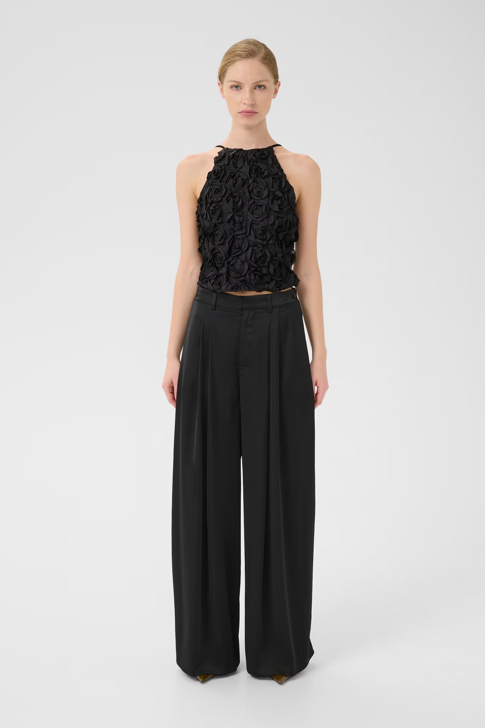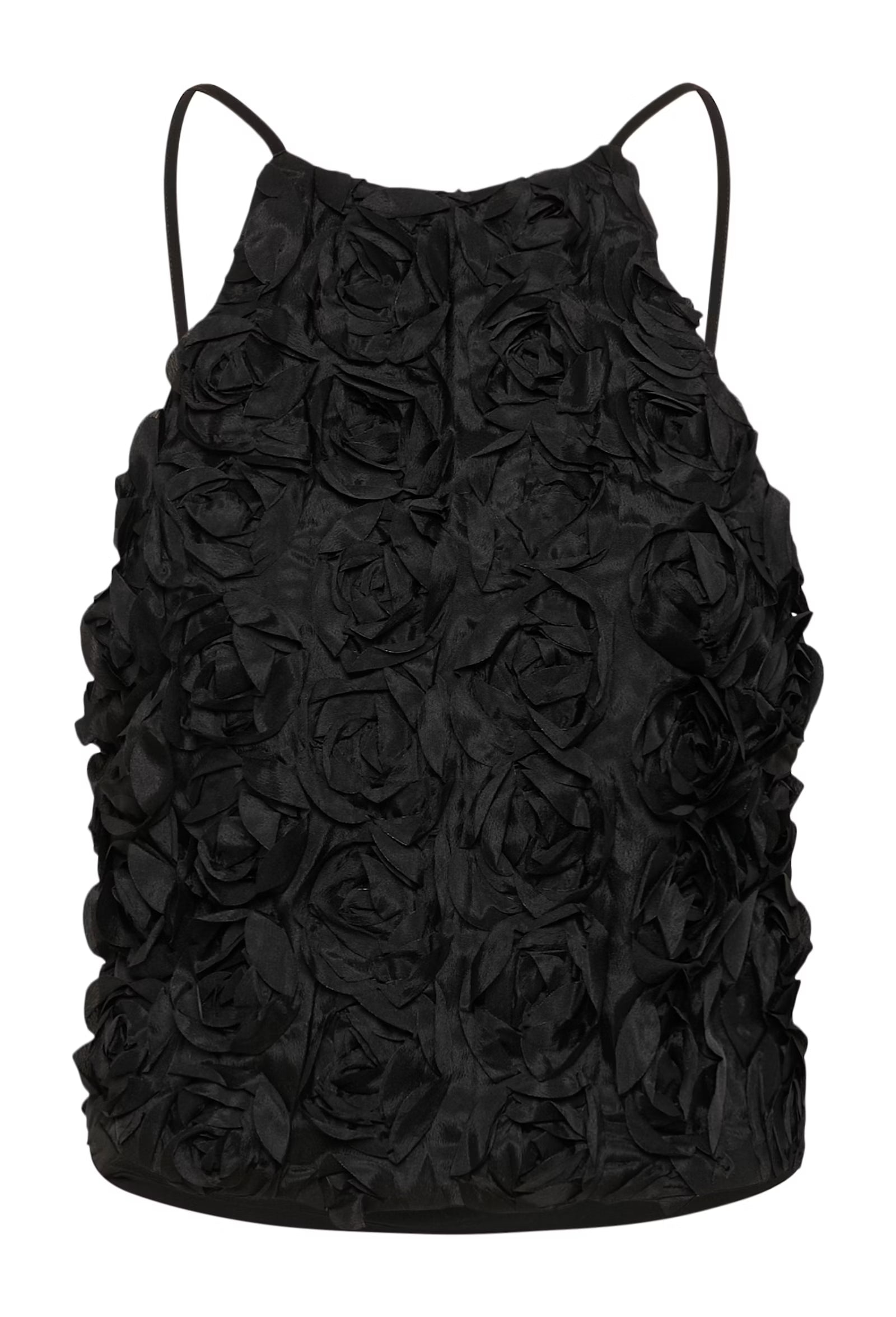 GZIngrid Blouse Black er en ermeløs topp med smale stropper og 3D-blomsterapplikasjoner foran. Designet med høy hals, justerbare stropper og strukturert passform for et elegant, teksturert uttrykk.