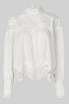 Tria Blouse fra Second Female er en bluse med blonde er laget i glatt og lett bomull med transparente blondedetaljer som gir et feminint og elegant uttrykk. Blusen har høy, rund hals med knappelukking bak, lange ermer med mansjetter og dekorativ bølget kant nederst. Den løse og luftige passformen gjør den behagelig å bruke, samtidig som den passer perfekt både til hverdags og mer pyntede anledninger.