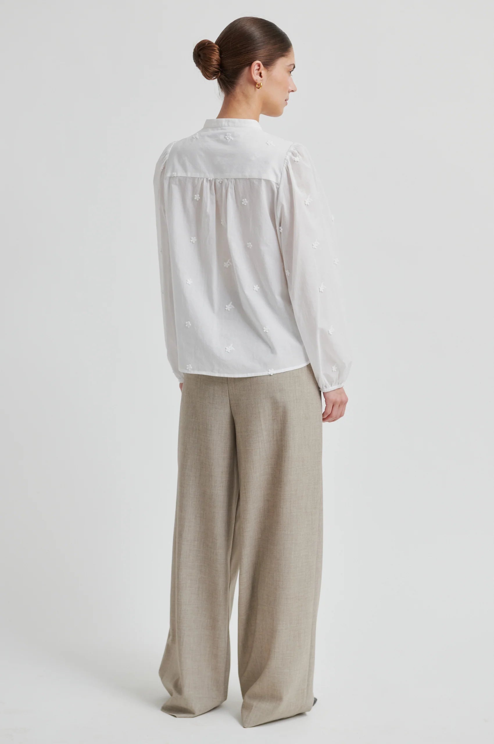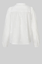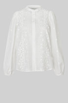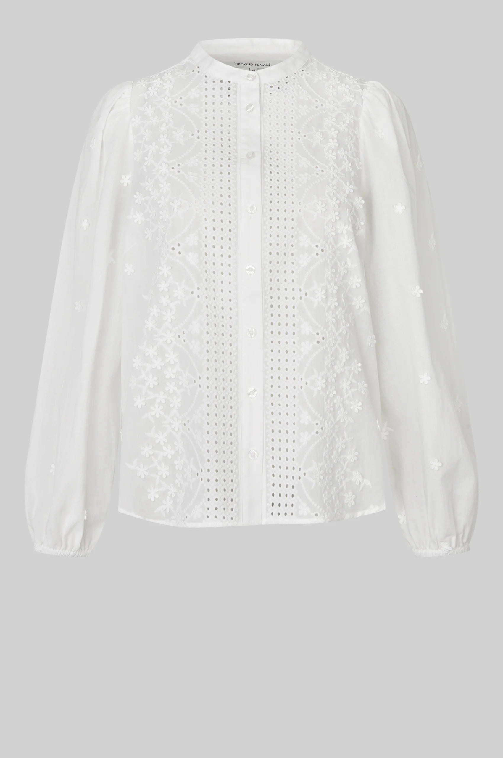 Civenna Shirt fra Second Female er en nydelig skjorte med 3D-detaljer i bomstermønster. Skjorten er laget i myk bomull med heldekkende 3D-broderi som går ton i ton. Med rund krage og knappelukking. Rynker på skuldrene og elastiske mansjetter som skaper puffermer. Normal i passform.