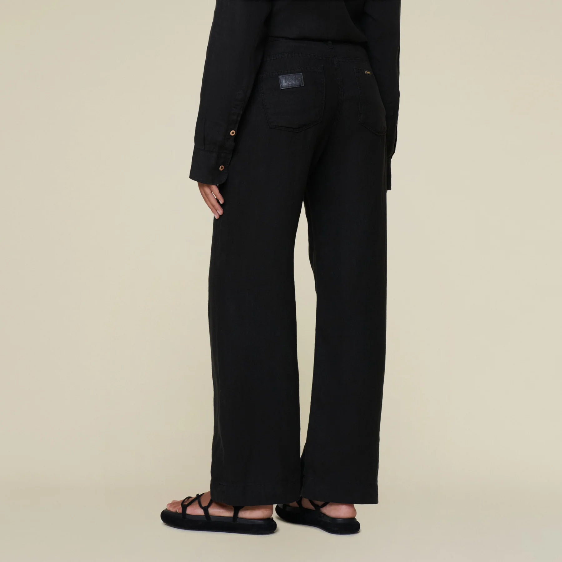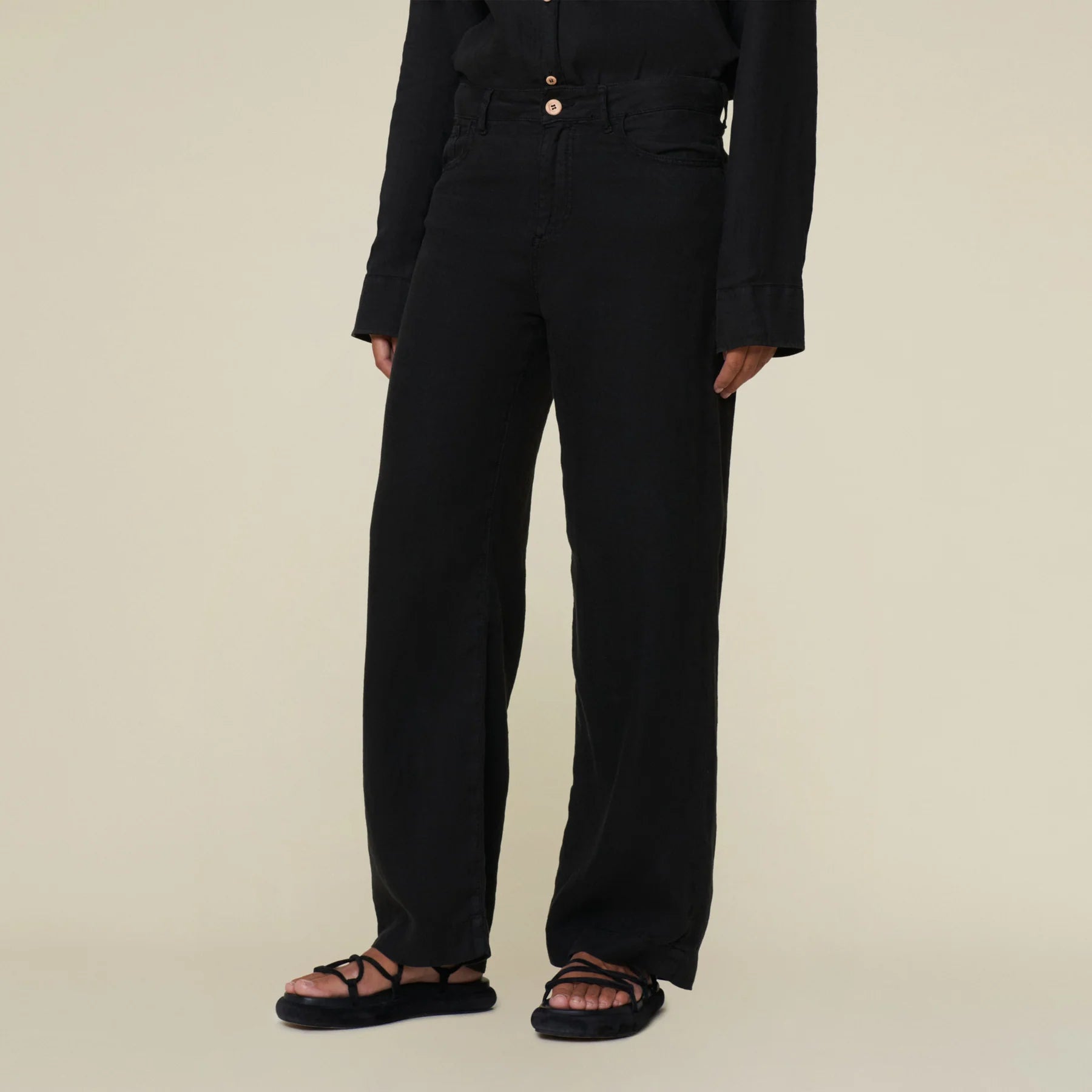 Culotte Linen Black er en lett og herlig linbukse fra Lois. Buksen har en avslappet passform med høyt liv, beltehemper samt rette og vide ben. Den er en 5-lommersmodell som lukkes med knapp og glidelås. Dette er den perfekte sommerbuksen for varme dager.