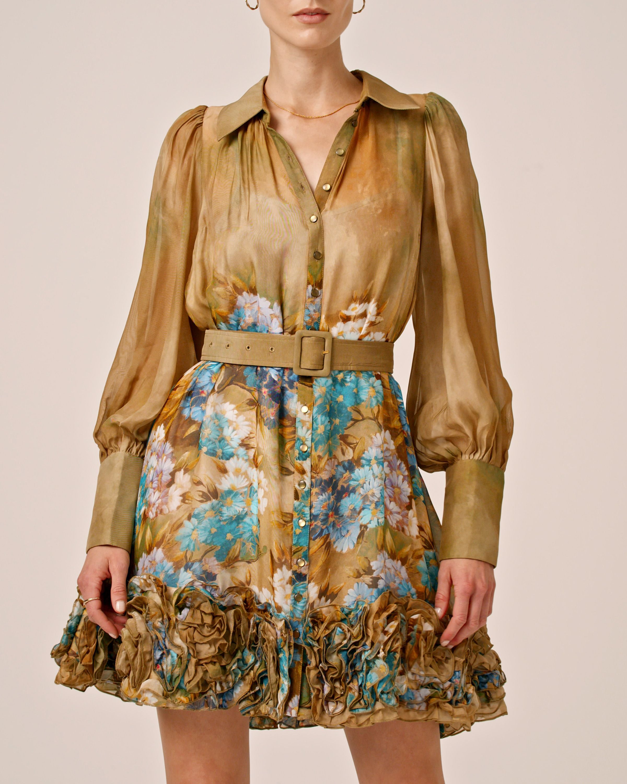 Organza Mini Dress fra byTiMo er laget i elegant viskosekvalitet. Kjolen har en minilengde, skjortekrage og lange puffede ermer med stramme mansjetter. Den har vakre knappedetaljer foran og på mansjettene. Skjørtet har mye volum. Kjolen kommer med en stroppekjole under og et løst, matchende belte.