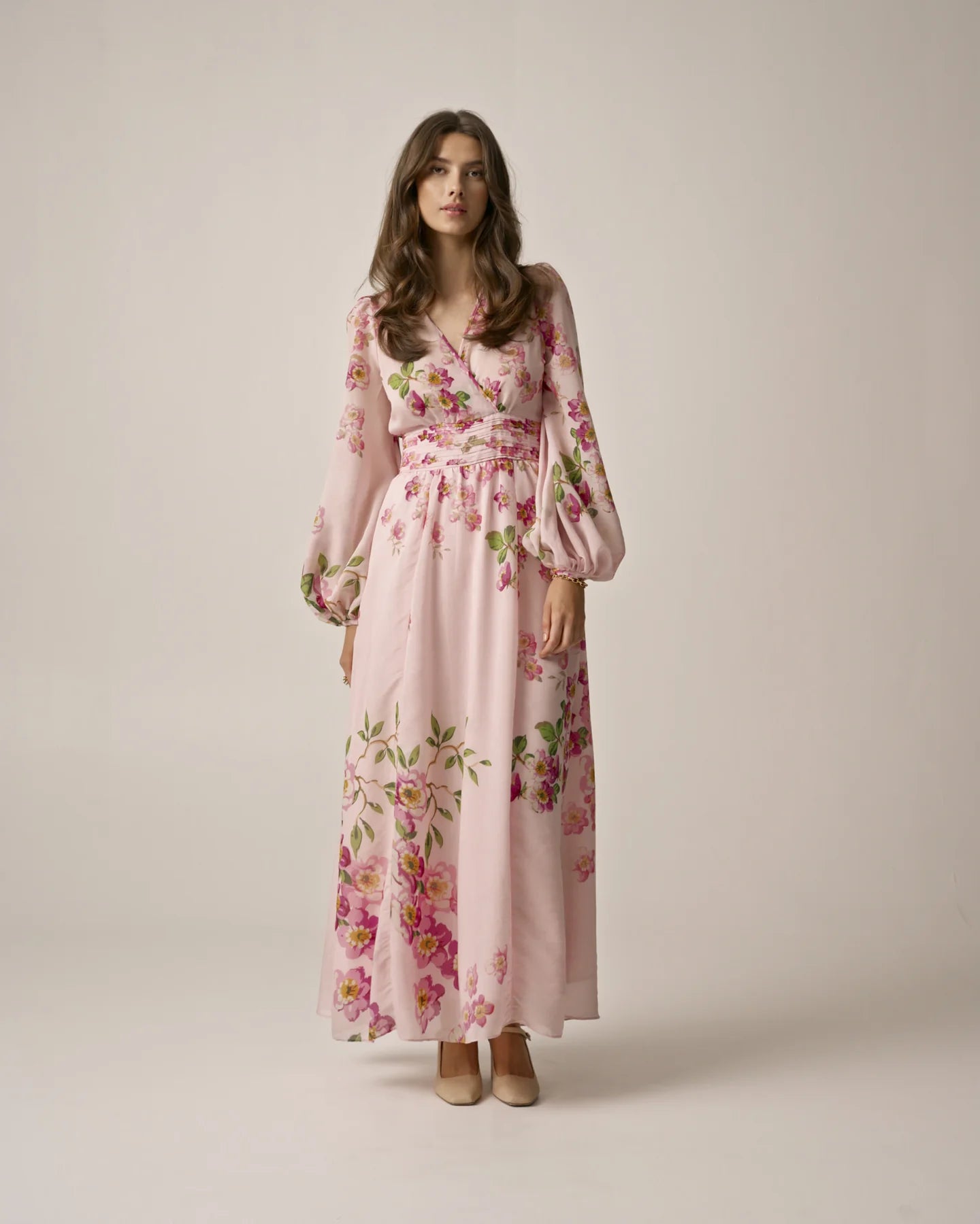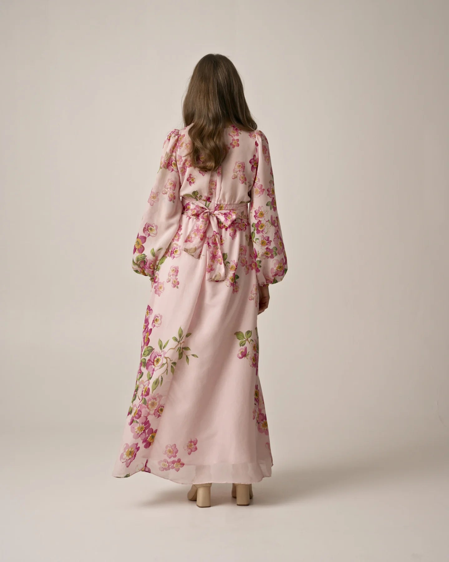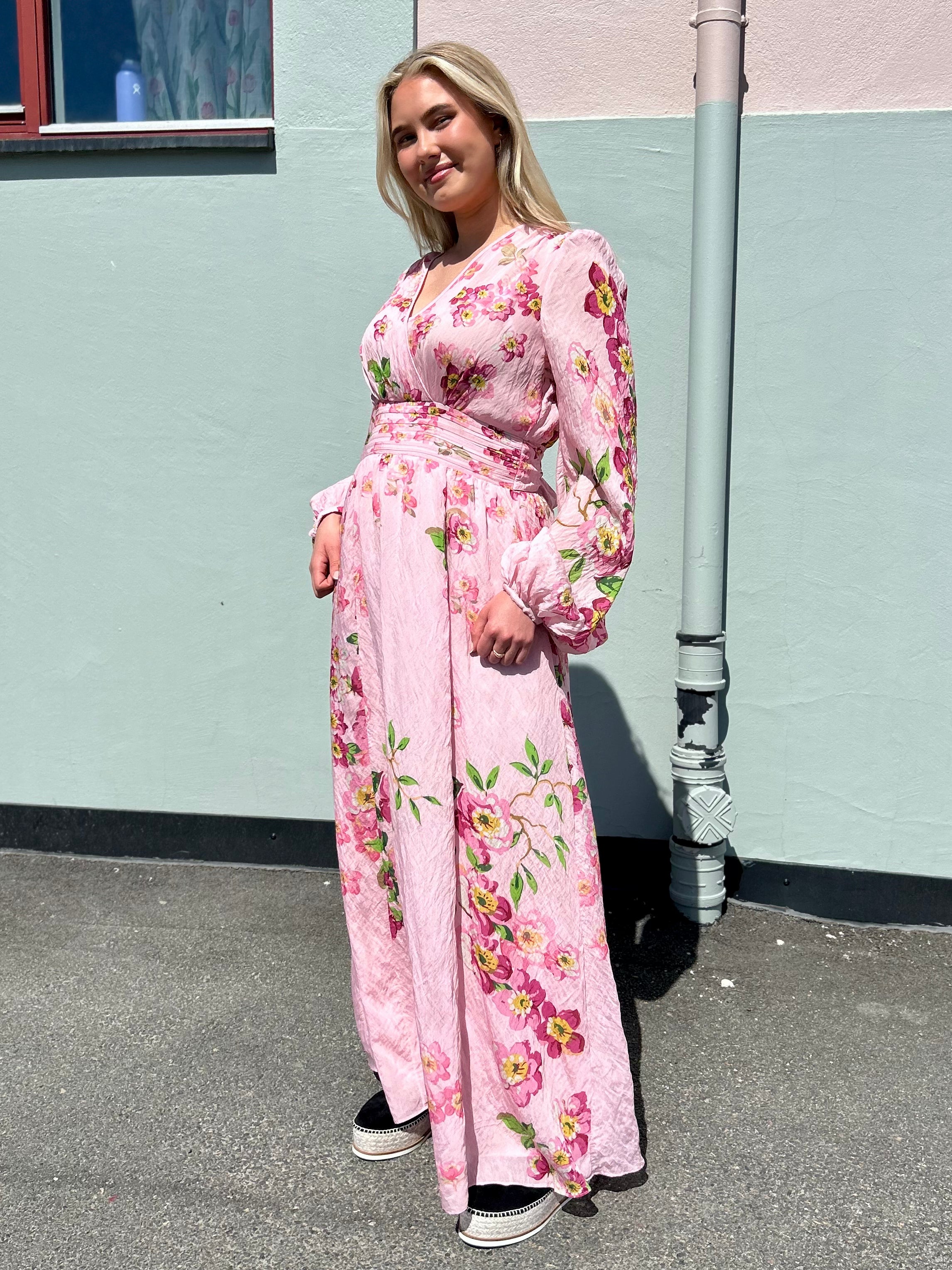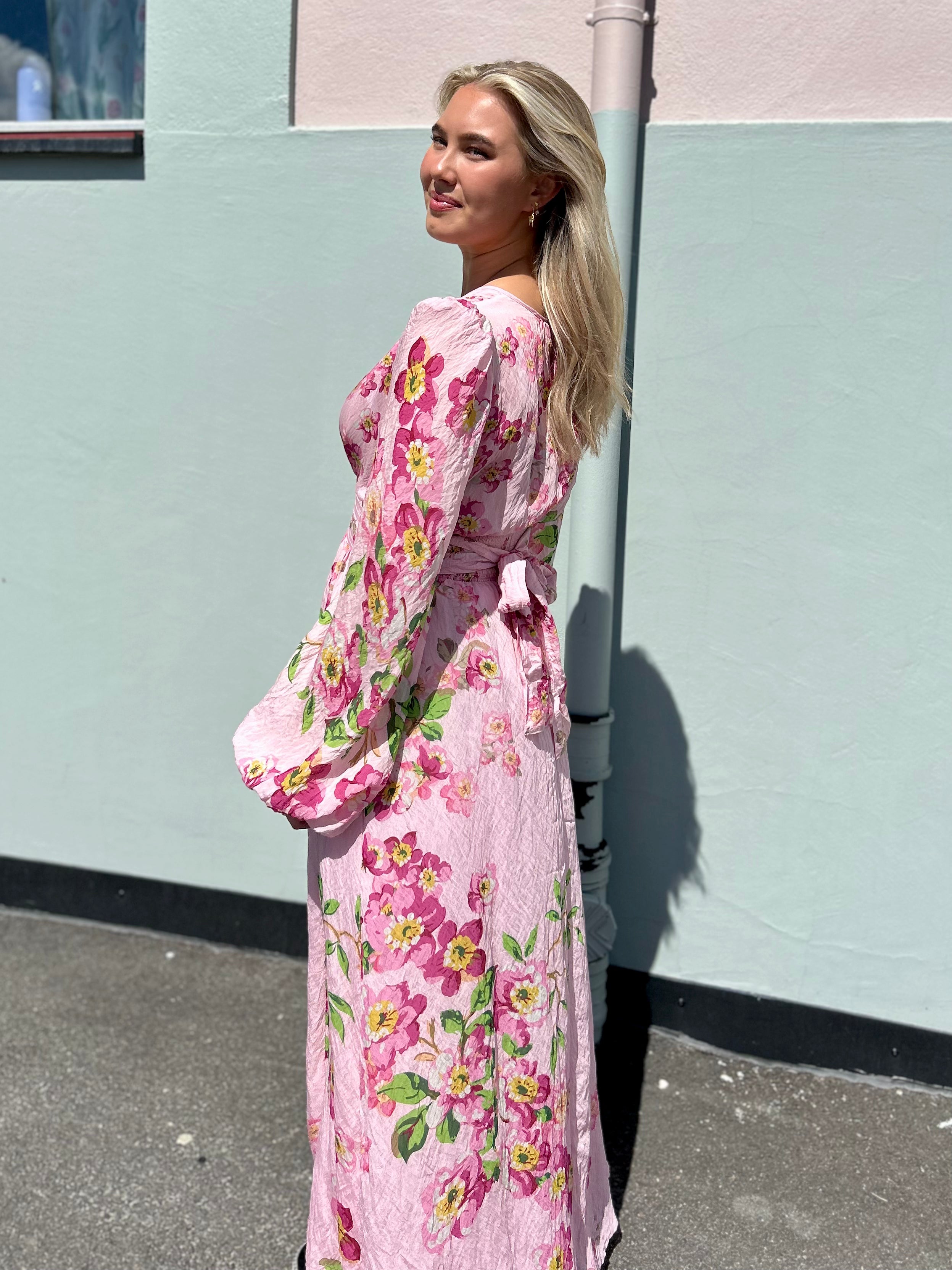 Viscose V-Neck Dress fra byTiMo. Vakker maxikjole fra byTiMo med et sommerlig blomsterprint i delikate farger. Viscose V-Neck Dress har v-hals, lange ballongermer med elastisk mansjett og innsvinget midje med belte som kan knytes bak for en flatterende silhuett. Kjolen har et langt maxiskjørt med volum og erlaget i byTiMos FCS sertifiserte viskoseblanding. Perfekt til finere anledninger denne sesongen som bryllup eller sommerfest.