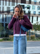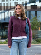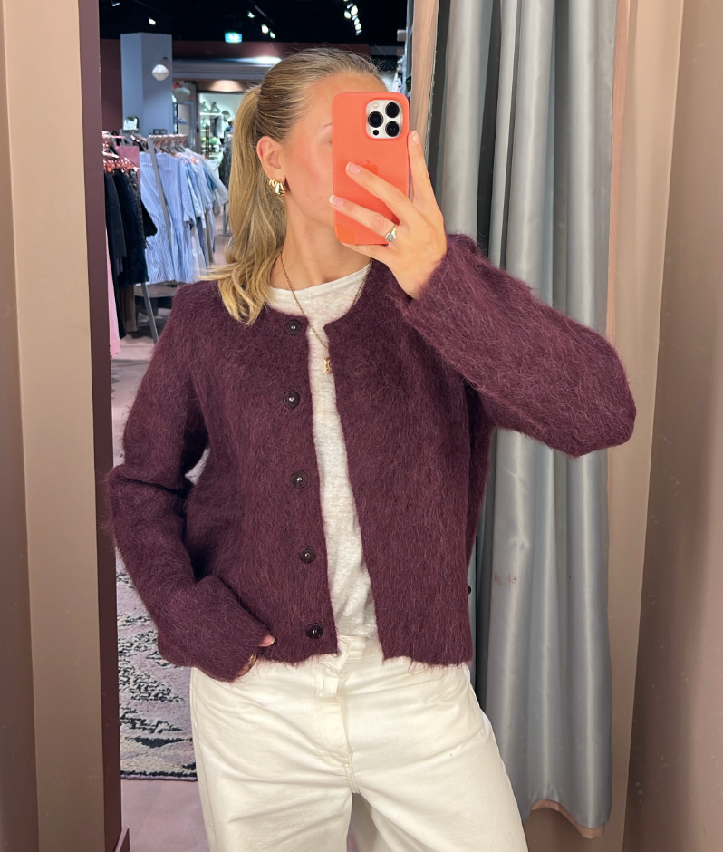 Hairy Knit Jacket Burgundy fra byTiMo er laget av byTiMos supermyke og pusete blanding av sertifisert alpakka. Cardiganen har en lett figursydd silhuett, lange ermer og rund hals. Mansjettene og kantene har vakre ribbedetaljer. Denne strikken er et tidløst plagg å ha i garderoben i årevis, du kan enkelt bruke den til hverdagsstilen din for en elegant touch, eller over favorittkjolen din.