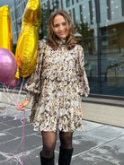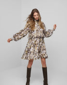 Georgette Tieband Dress fra ByTiMo er en minikjole i lett, transparent FSC-sertifisert viskose med et vakkert jacquardmønster i gull. Kjolen har en ledig A-linjeform med lange ermer og elastiske mansjetter, volangdetalj over midjen og en volangkant nederst. Den høye halsen lukkes med et knytebånd i nakken, noe som gir kjolen et elegant uttrykk.
