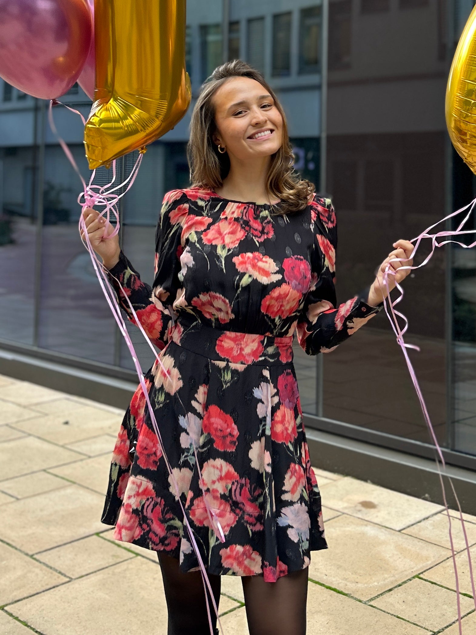 Viscose Mini Dress fra byTiMo. Viscose Mini Dress er kuttet i byTiMos sertifiserte viskosekvalitet med en subtil glans og et sjarmeerende blomsterprint. Kjolen har minilengde, figursydd midje, rund hals, knapper foran og puffede ermer med stramme mansjetter. Skjørtet har et vakkert volum.