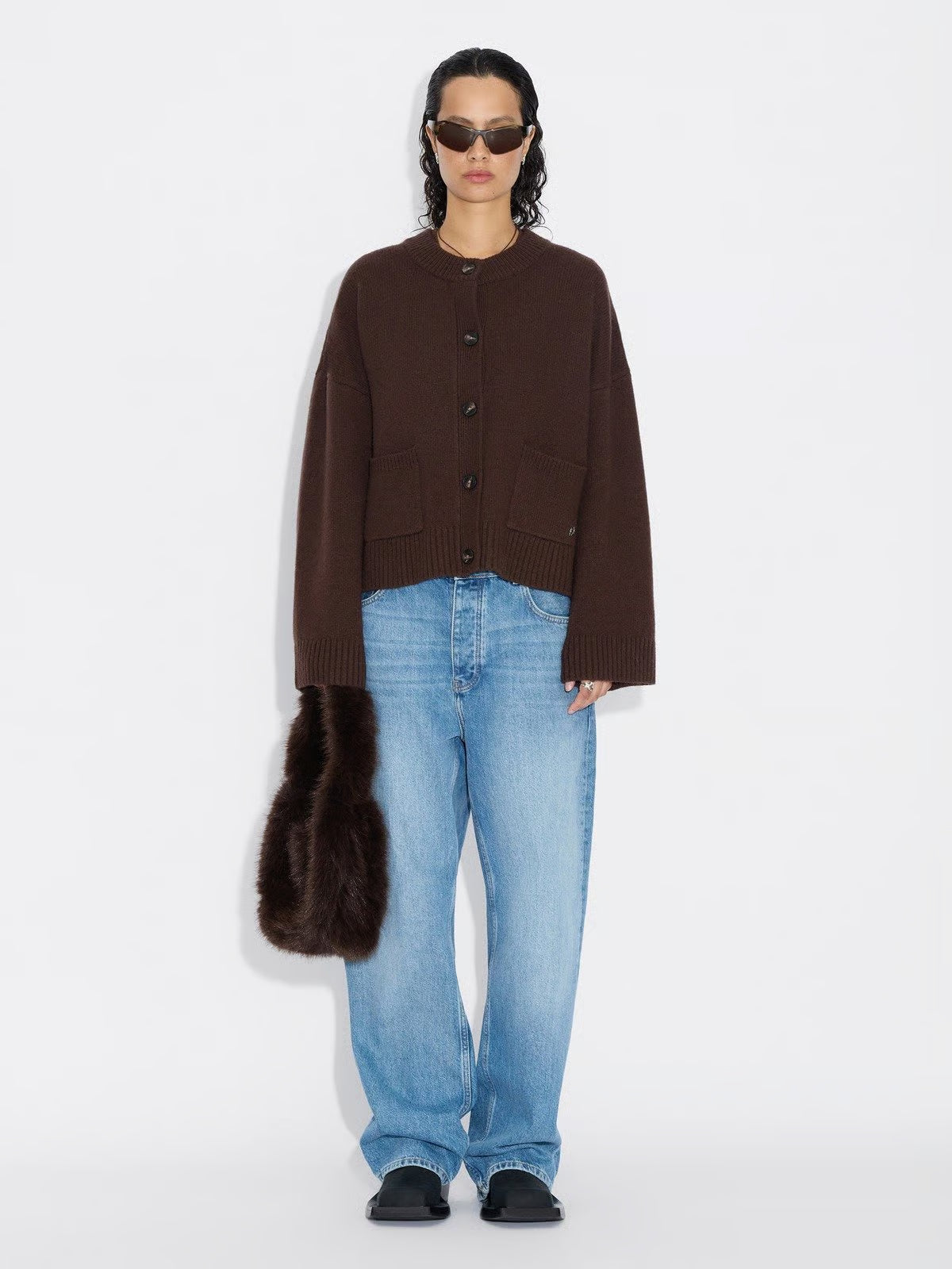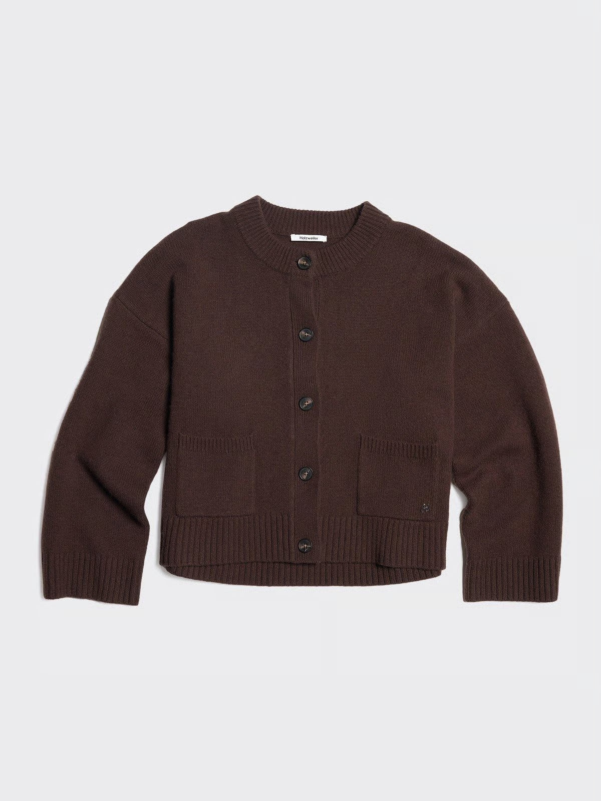 W. Wool Wide Cardigan i mørk brun fra Holzweiler er en minimalistisk og tidløs cardigan laget av 100 % ren ull. Designet har en avslappet passform med droppede skuldre, knappelukking i front, påsydde lommer og ribbestrikkede kanter for en gjennomført finish. Et diskret metallogo-detalj gir et eksklusivt preg. Perfekt som et mykt og varmt lag gjennom høst og vinter.