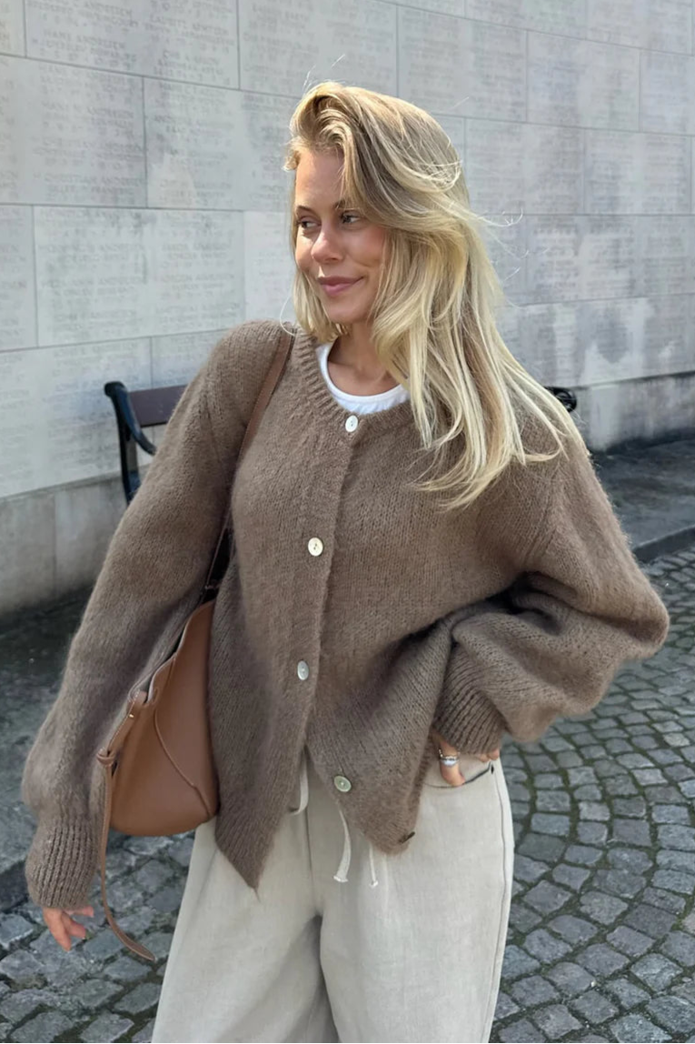 IdaIC Cardigan fra ByIC i fargen Camel er en myk og fluffy cardigan med voluminøse ermer og elegante ribbestrikkede detaljer. Den lukkes med dekorative perlemorsknapper som gir et feminint og sofistikert preg. En lun og stilfull favoritt som passer like godt til hverdags som til penere anledninger.
