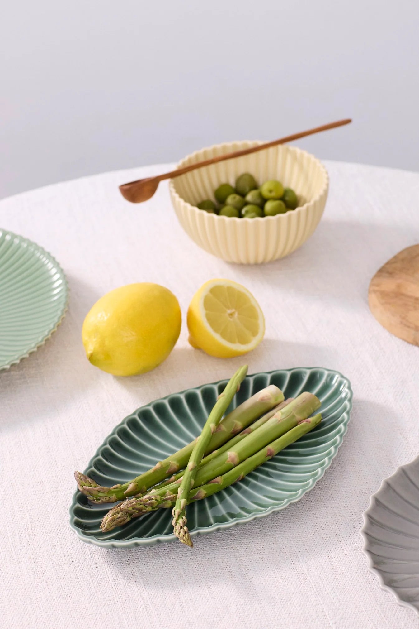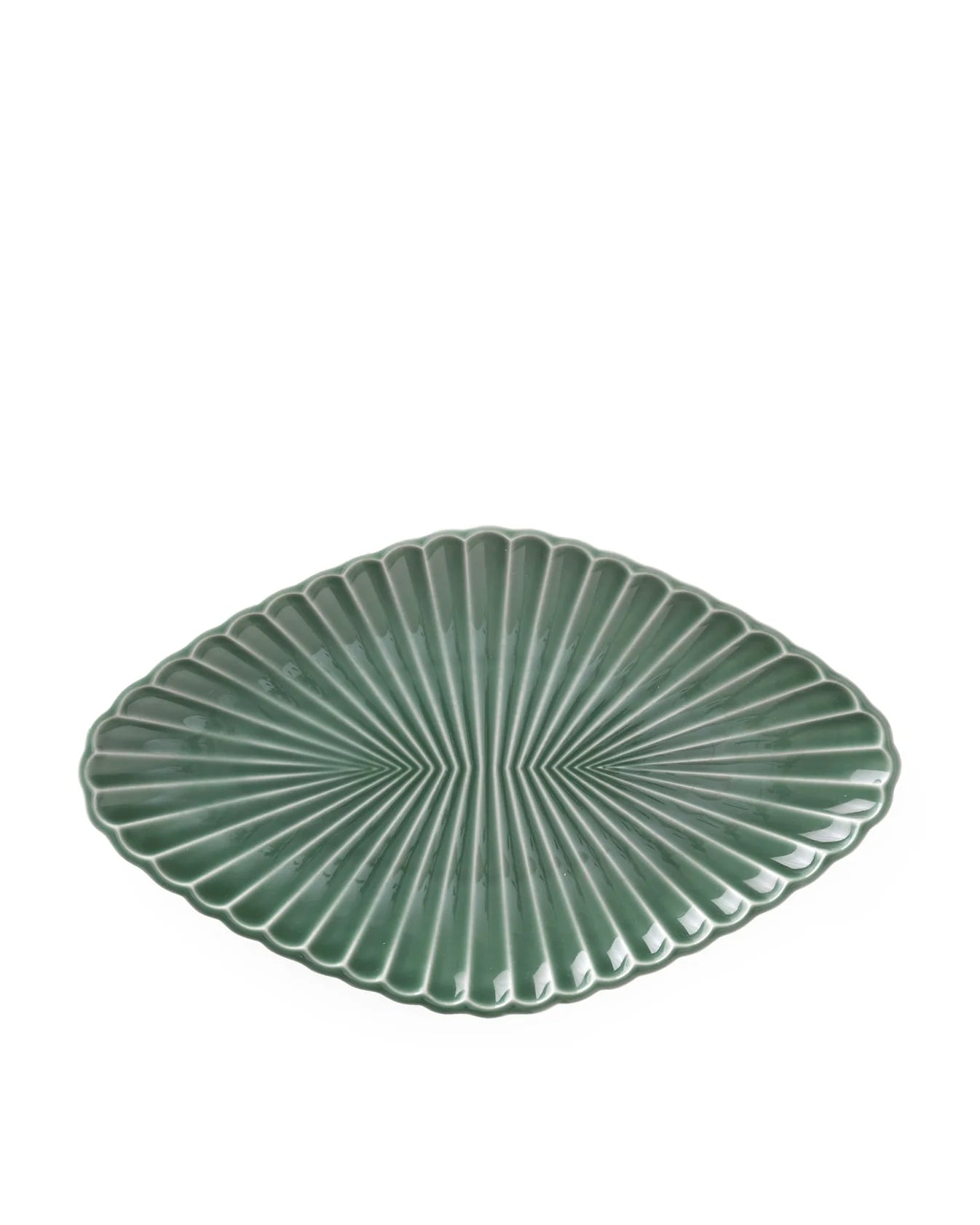 Samsurium Assiette i Spruce er en vakkert laget, allsidig tallerken designet for å heve din matopplevelse. Denne lille, men elegante tallerkenen måler 26,5 cm x 16 cm, og er perfekt for å servere en rekke godbiter – enten det er fersk asparges, frukt, kjeks eller dekadent sjokolade. Den fantastiske grangrønne glasuren og den intrikate, viftelignende teksturen gir et snev av naturlig skjønnhet til bordet ditt, noe som gjør det til et iøynefallende stykke som utfyller enhver setting.