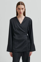 Glari Wrap Shirt Black fra Second Female er en elegant omslagsskjorte laget i et glatt og lett materiale med fin drapering. Skjorten har en kryssende front som knytes i siden, skulderputer og lange ermer med brede, justerbare mansjetter. Den har en normal passform som gir et sofistikert og moderne uttrykk.