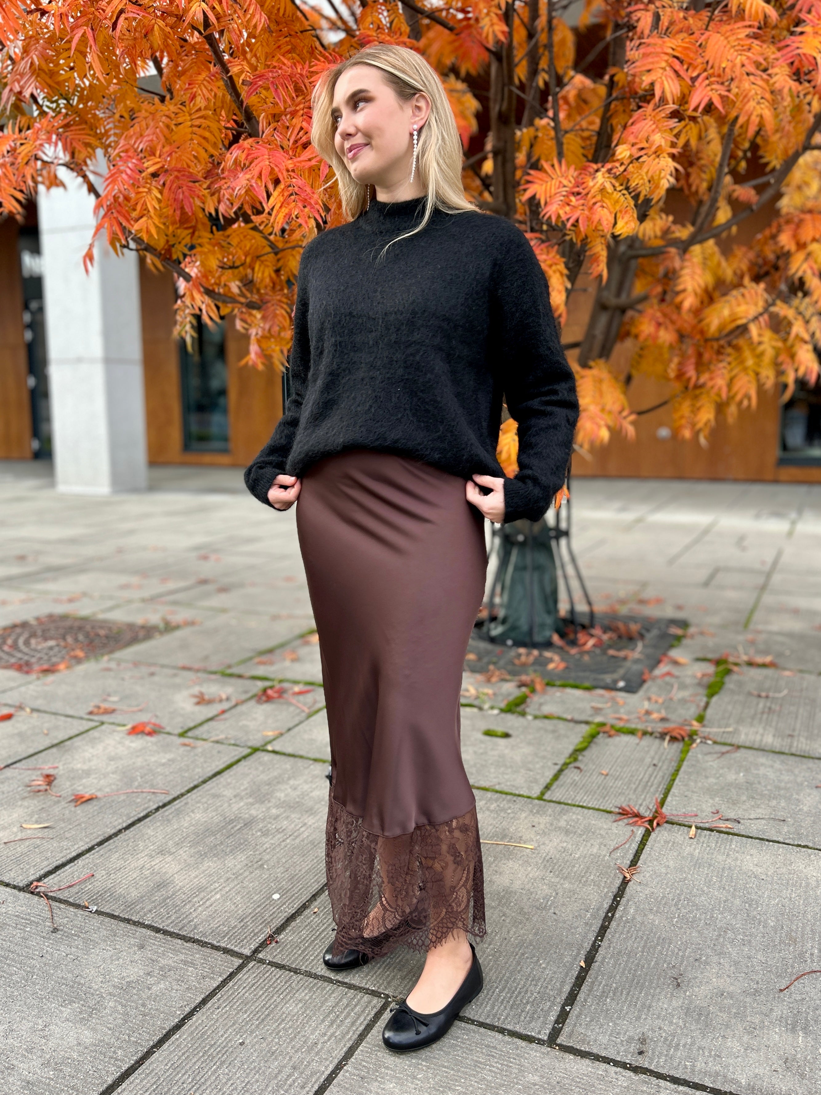Lumine Skirt Choco fra From Paris with Love er et nydelig satengskjørt med blondekant.