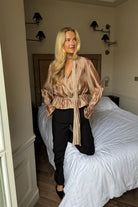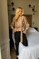 FreyaIC Shirt Light Brown fra ByIC er en feminin bluse med avslappet passform og markert midje. Den dype V-utringningen med omslagsdetalj og fine volanger gir et elegant uttrykk, mens de lange ermene med elastiske mansjetter skaper en lett puffet silhuett. En tidløs og flatterende bluse som passer like fint til hverdags som til fest.