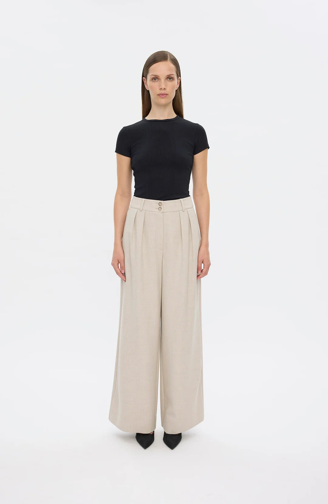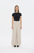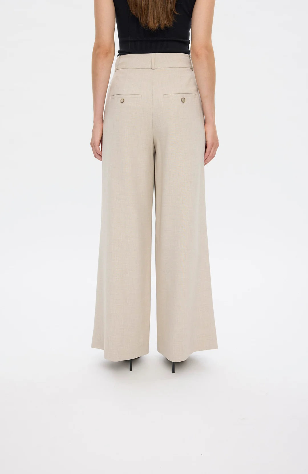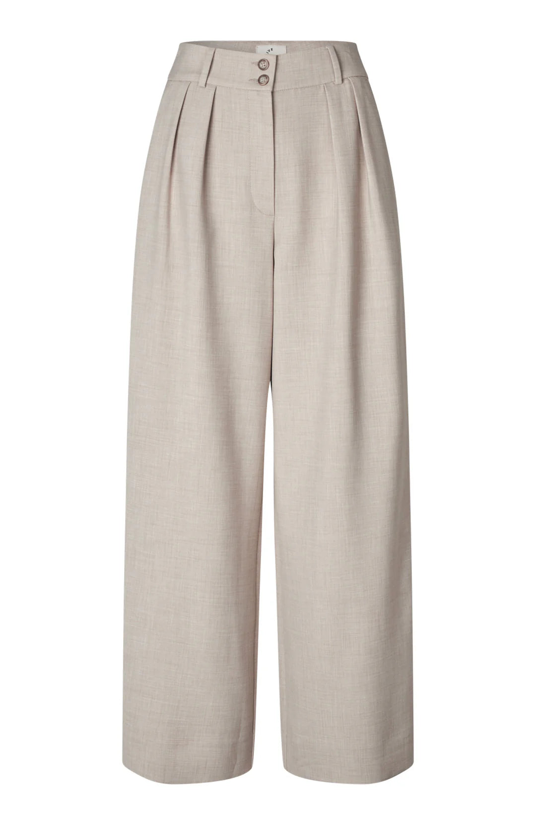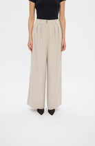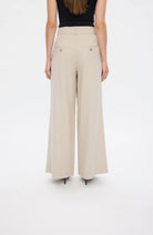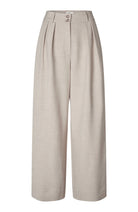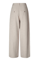 KarenFV 085 Silver Sand Melange Regular fra Five Units er bukser med høy midje og dobbel knappelukking. Modellen er skåret i en romslig wide-leg silhuett som følger kroppens former på en flatterende måte. Det allsidige designet er holdt rent og elegant, med beltehemper, sidelommer og passpolerte baklommer med knapp. Pressfolder i front gir buksen et skreddersydd og sofistikert uttrykk.