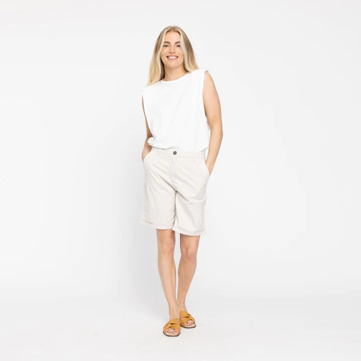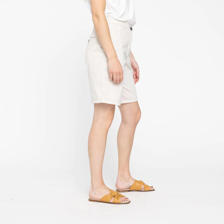 Emma Shorts fra Five Units er en komfortabelt laget i tett satengvevd stoff med et uformelt utseende og designet med oppbrettede falder. De er midt i midjen, hviler på hoftebenet og har en midi-lengde som ender på midten av lårene.