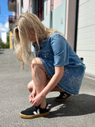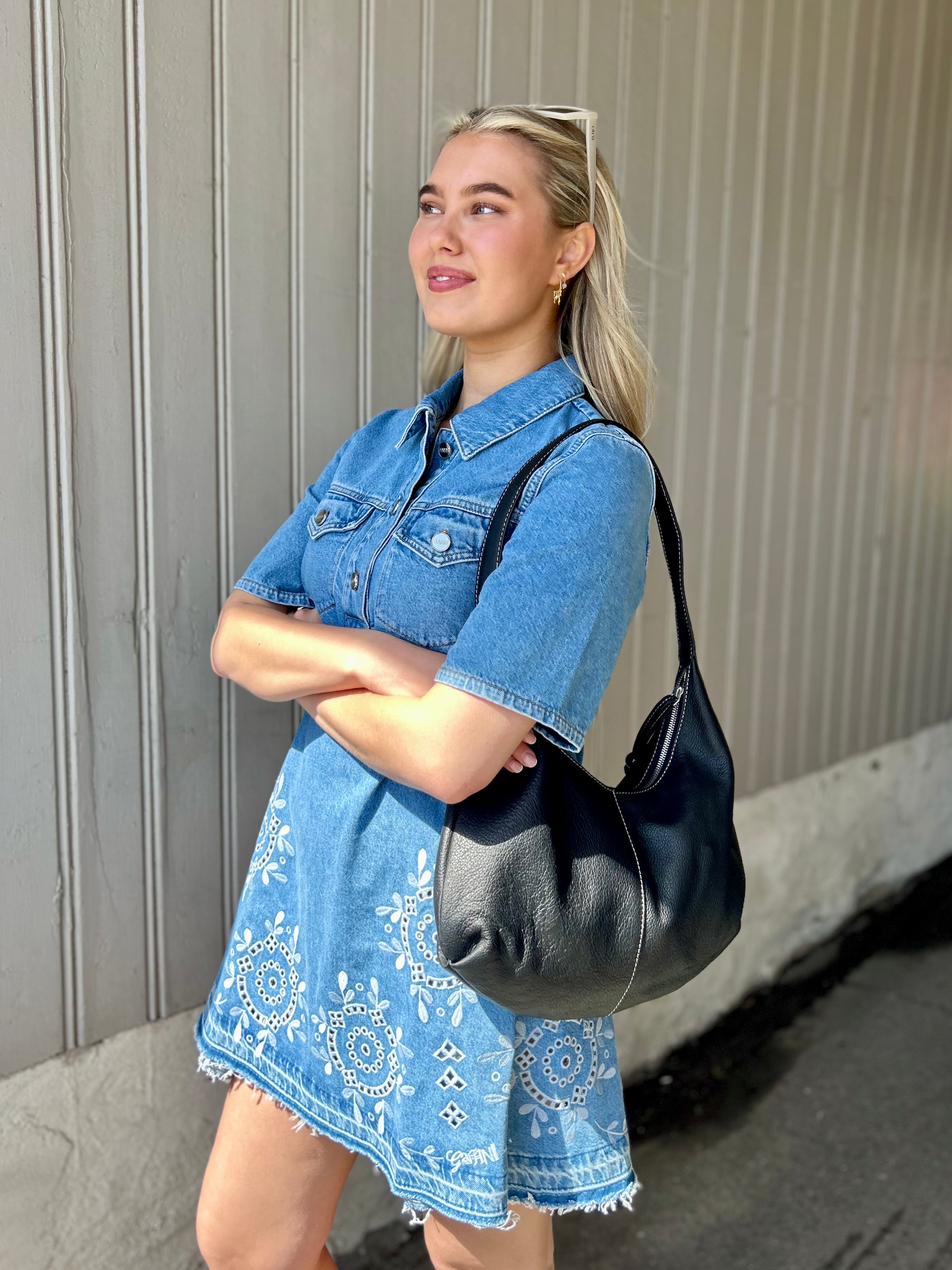 Broderie Anglaise Denim Mini Dress Light Blue Stone fra Ganni kombinerer et feminint uttrykk med en avslappet silhuett. Kjolen har klassisk krage, knappelukking og albuelange ermer, mens de praktiske frontlommene gir et casual preg. Den lett utsvingte A-linjeformen gir en flatterende passform, perfekt for både hverdagsbruk og sommerlige anledninger.