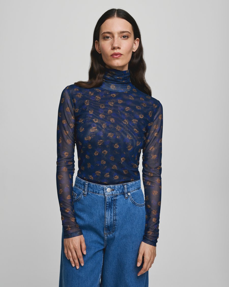 Ginie Illenora Top AOP fra MSCH Copenhagen er en meshbluse med høy hals, lange ermer og et feminint blomsterprint. Den lett gjennomsiktige kvaliteten gir et moderne og elegant uttrykk, perfekt til lag-på-lag-styling. Bruk den under en blazer eller strikk for en sofistikert look, eller alene med jeans eller skjørt for et feminint antrekk.