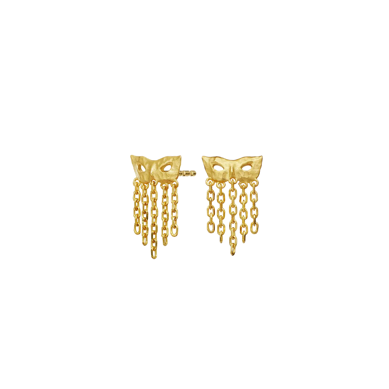 Celare Earrings fra Maanesten. Øredobber med elegant maskemotiv og gylne kjeder som tilfører et magisk og teatralsk uttrykk.
