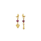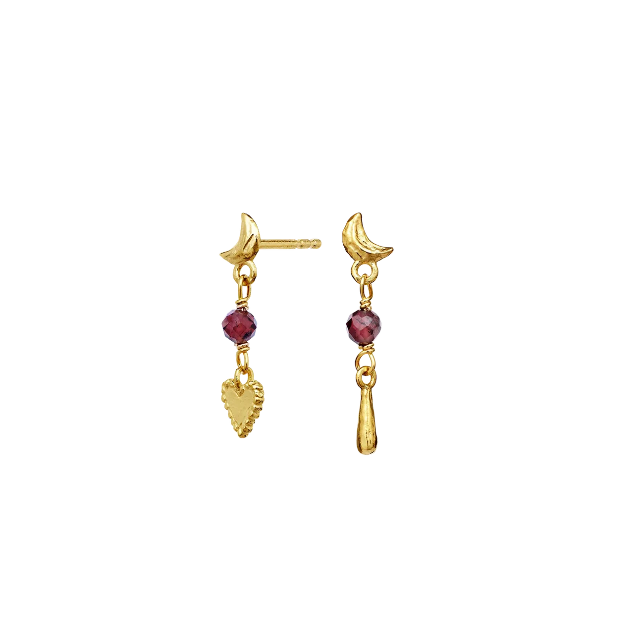 Nouva Earrings fra Maanesten. Halvmåner, med rosa granater, dråper og hjerter hengende fra seg, symboliserer kjærligheten som omgir oss alle.