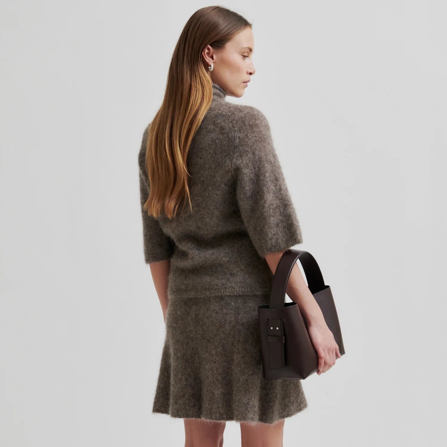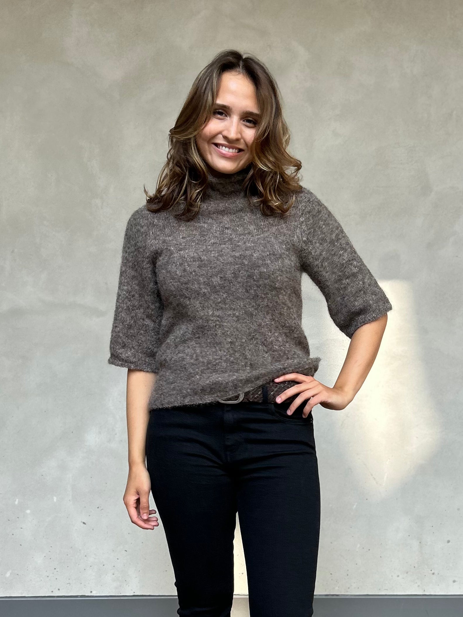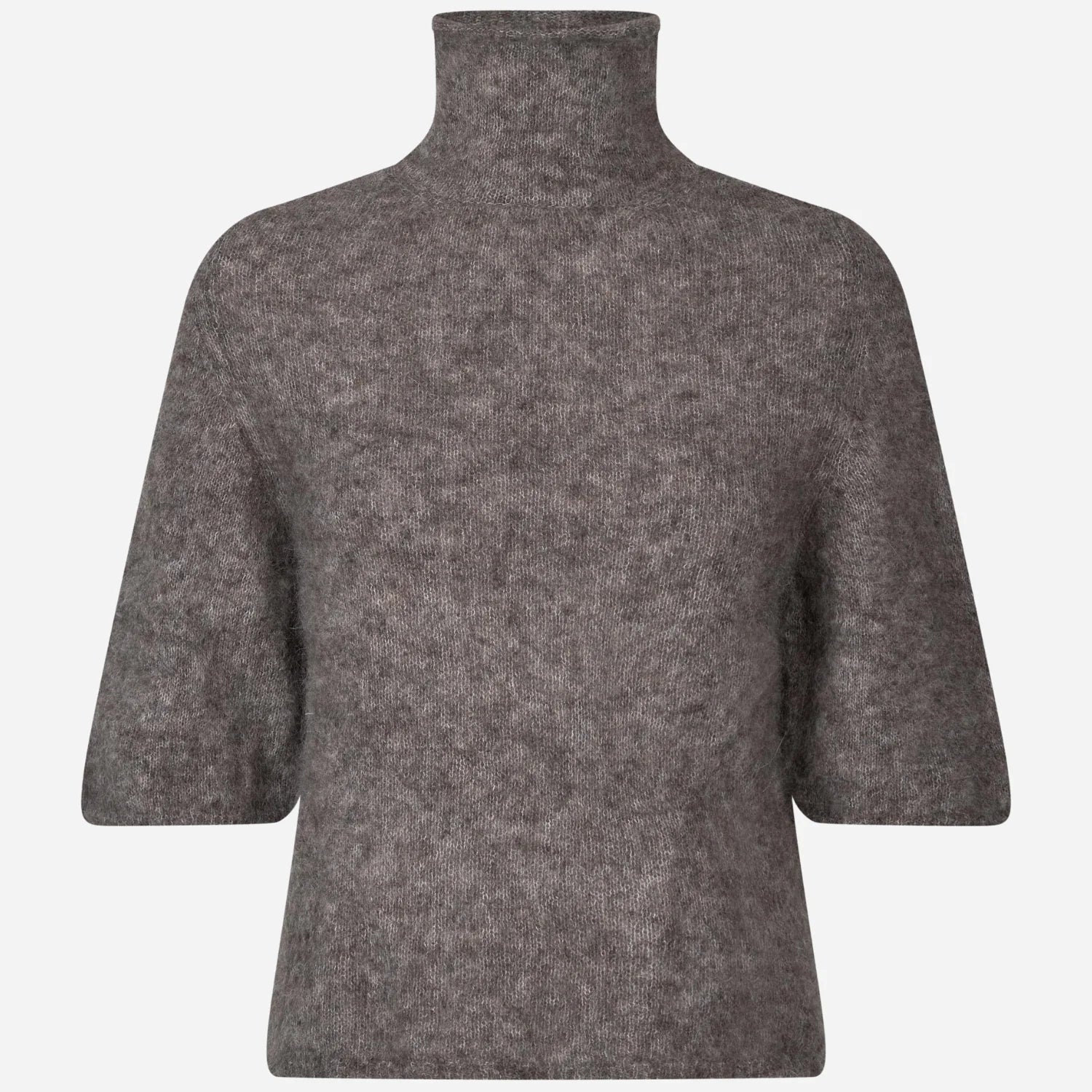 Denne turtleneck-strikken med korte ermer fra Second Female kommer i en varm brun fargetone og er laget i en myk og vamset kvalitet med mohair og alpakka. Strikken har en normal og slank passform og er tro mot størrelsen. Materialblandingen gir både luksus og komfort, og gjør plagget til et tidløst og allsidig tilskudd i garderoben.