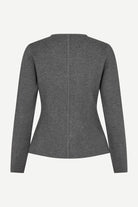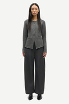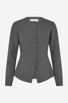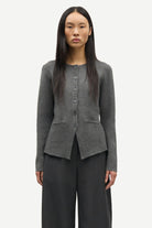 Salula Jacket 15825 Dark Grey fra Samsøe Samsøe. Kort jakke med smal passform og et elegant, strukturert uttrykk. Jakken har rund hals, knappelukking i front og klaffelommer. Laget i et dobbeltvevd materiale med elastisk kvalitet av LENZING™ ECOVERO™ Viskose, et miljøvennlig materiale sertifisert med EU Ecolabel.