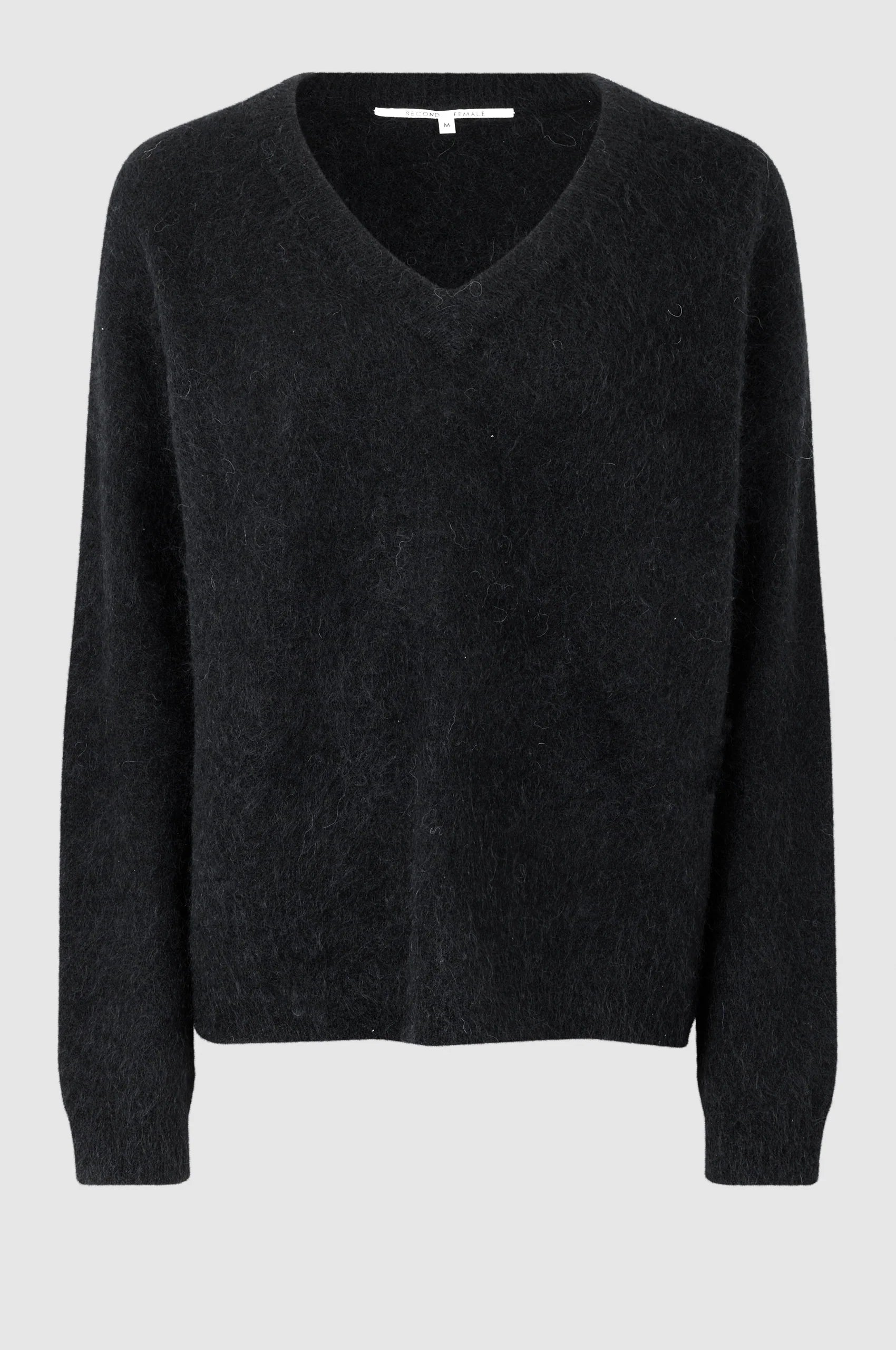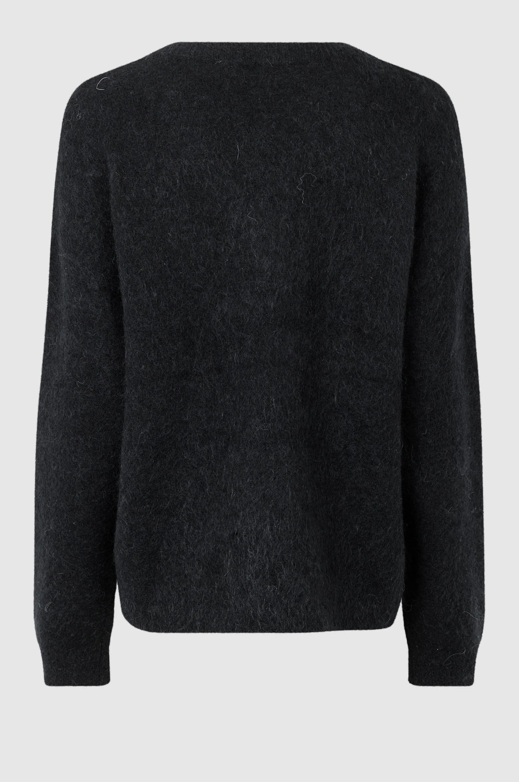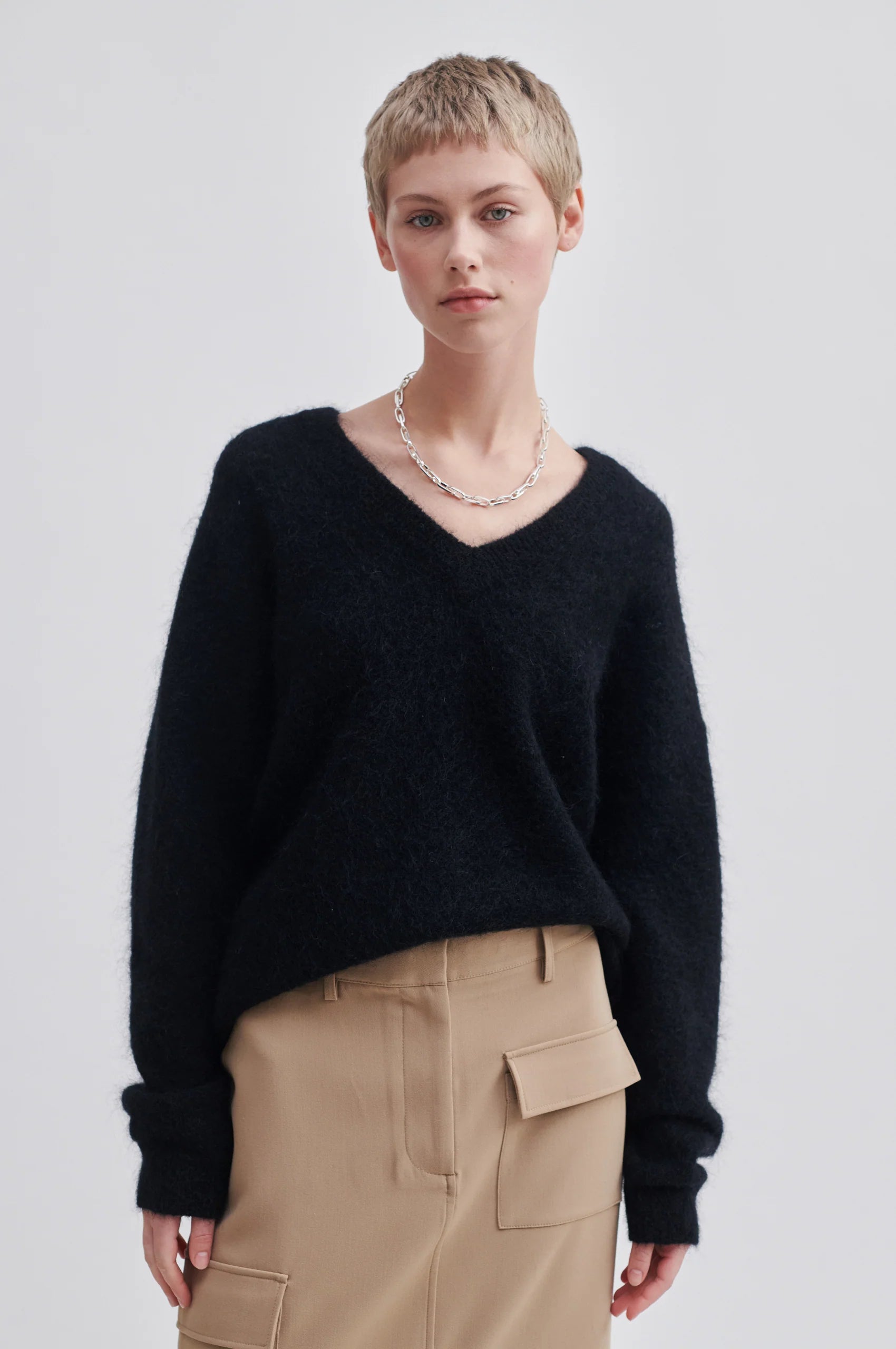Brook Knit Oversize V-Neck fra Second Female er en strikkegenser laget i en myk og elastisk mohair-ullblanding med lett og luftig tekstur. Med V-utringning og senkede skuldre med lange ermerBred, løs og slouchy passform som skaper et avslappet og uformelt uttrykk.