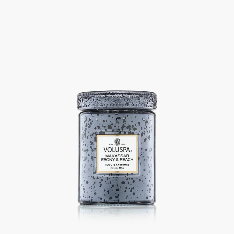Small Jar Candle fra Voluspa. Makassar Ebony & Peach Mini Tin Candle er et luksuriøst duftlys fra Voluspa med duft av sort ibenholt, modne fersken og epleblomst.