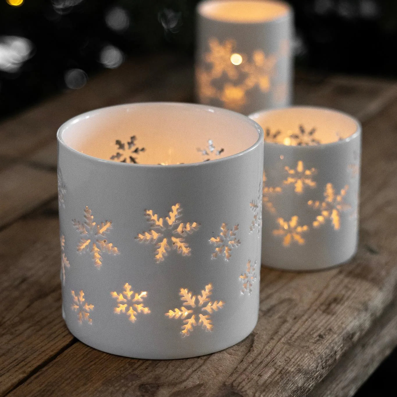 T-lysholder Snøkrystall Large Hvit fra sögne er laget av tynt porselen med et vakkert mønster som slipper lyset mykt gjennom, en ny julefavoritt i hjemmet. Den lyser nydelig alene, men er også fin å kombinere med flere for et stemningsfullt uttrykk.