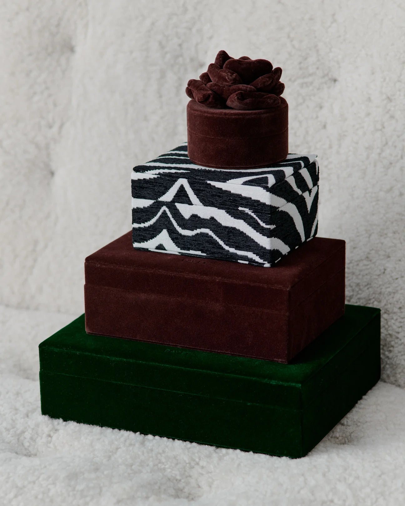 Day Velvet Flower Jewelry Round Winetasting fra DAY er et rundt smykkeskrin med en dekorativ blomst på lokket, laget i myk velur både innvendig og utvendig. Innsiden har praktiske rom for ringer, halskjeder og små øredobber, med ringdeler og kroker i lokket for enkel organisering. Den magnetiske lukkingen holder alt trygt samlet på en elegant måte.