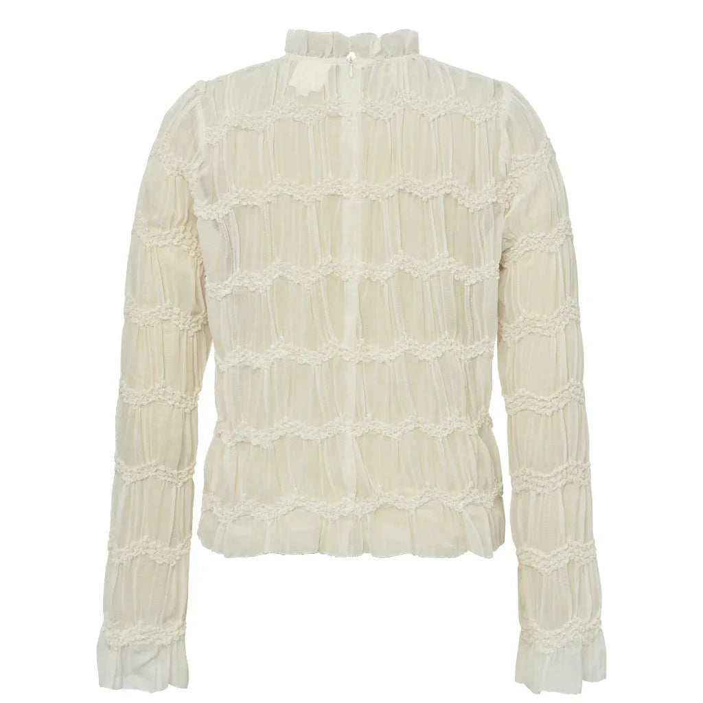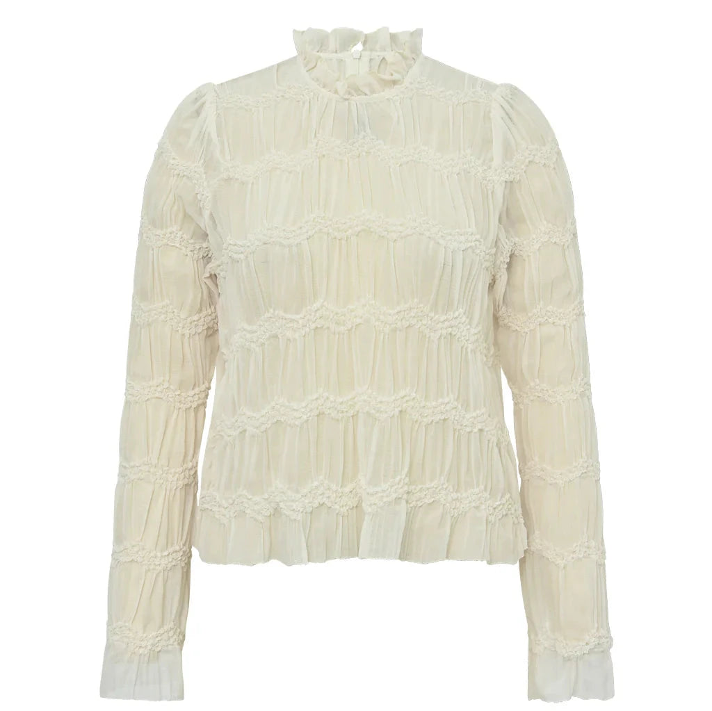 PinaraGo Blouse fra Gossia er en bluse med et detaljert rynket design over hele stoffet. Blusen har lange ermer og ruching-detaljer i horisontale striper som skaper tekstur og dybde i stoffet. Ermene har rynkede mansjetter som gir ekstra volum. Kragen er høy og dekorert med små volanger, som gir et feminint og elegant preg. Toppen har en glidlås lukking bak i nakken.
