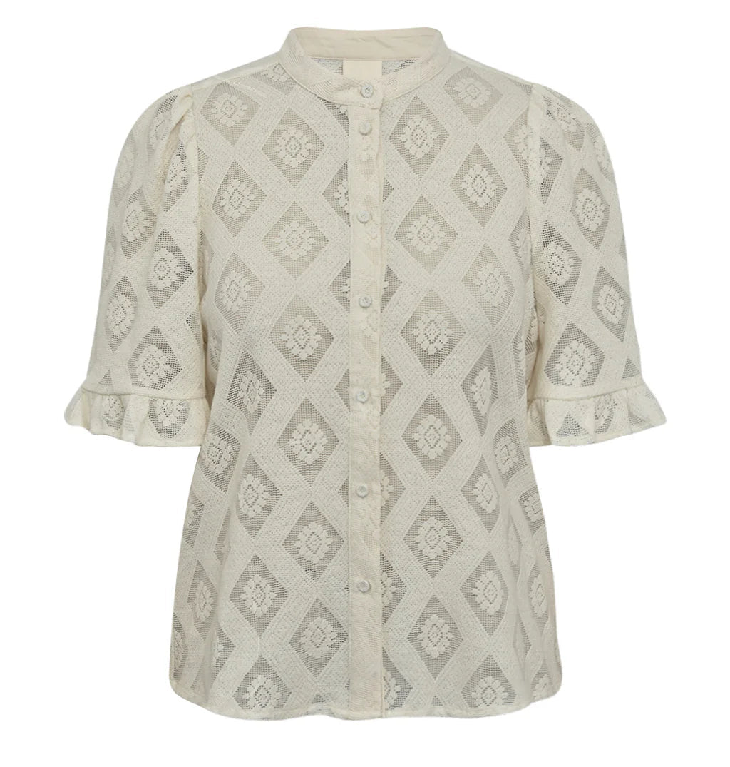 PukGO Shirt Creme er en vakker, semitransparent skjorte fra Gossia i jacquardmesh som gir et sofistikert og feminint uttrykk. De lette puffermene og de delikate volangdetaljene på ermene tilfører et særpreg som gjør skjorten ekstra spesiell. Overdelen kan styles med en enkel topp under og kombineres med høytlivsjeans eller et skjørt for et elegant hverdagsantrekk, eller matches med sorte bukser og smykker for en stilfull kveldslook med et hint av edge.