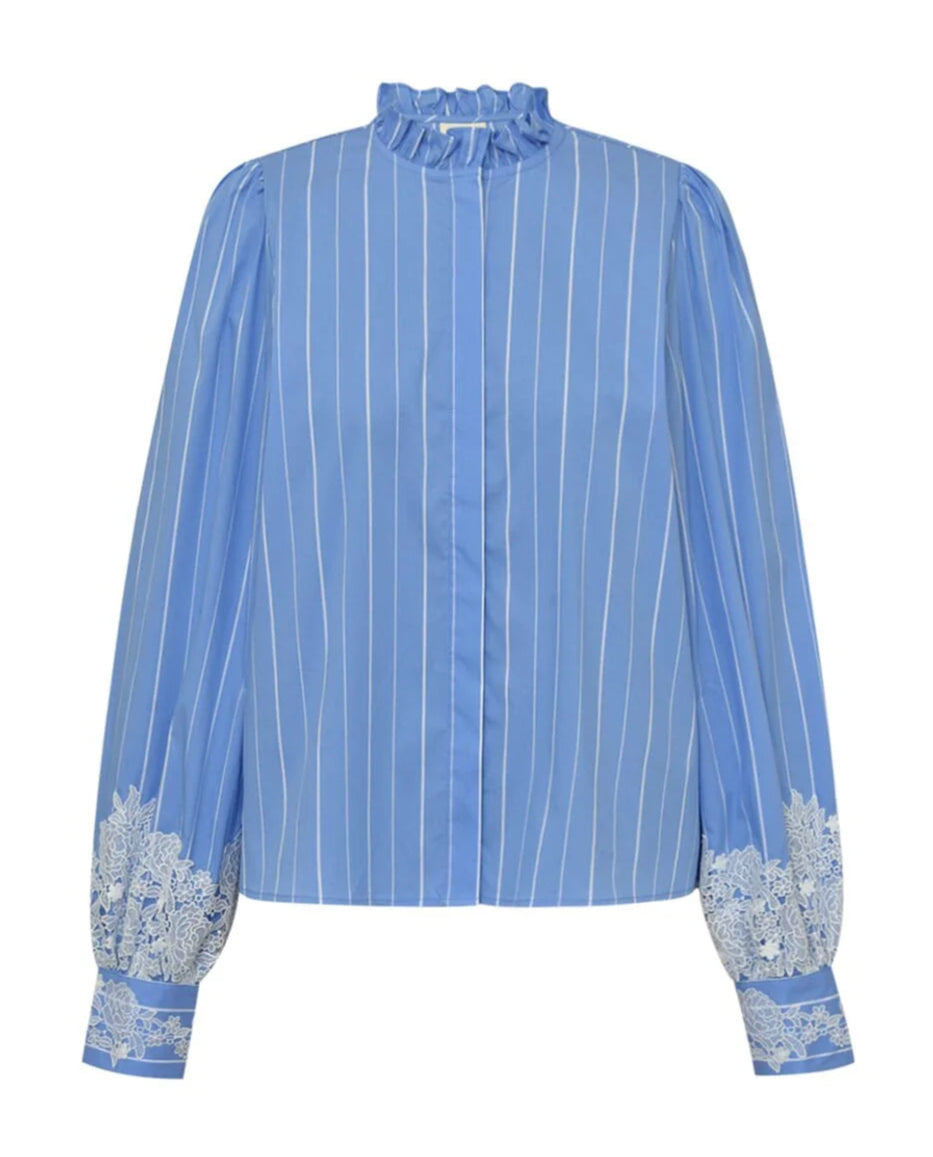 øt stripet skjorte med blonder og feminine puff-ermer som avsluttes med en delikat blondekant på mansjettene og ermene. En liten volang i kragen fullfører det romantiske og sofistikerte uttrykket. Style skjorten med jeans for et feminint hverdagsantrekk, eller med en elegant skjørt og støvler for et mer dresset uttrykk, perfekt både på kontoret og til middag ute.