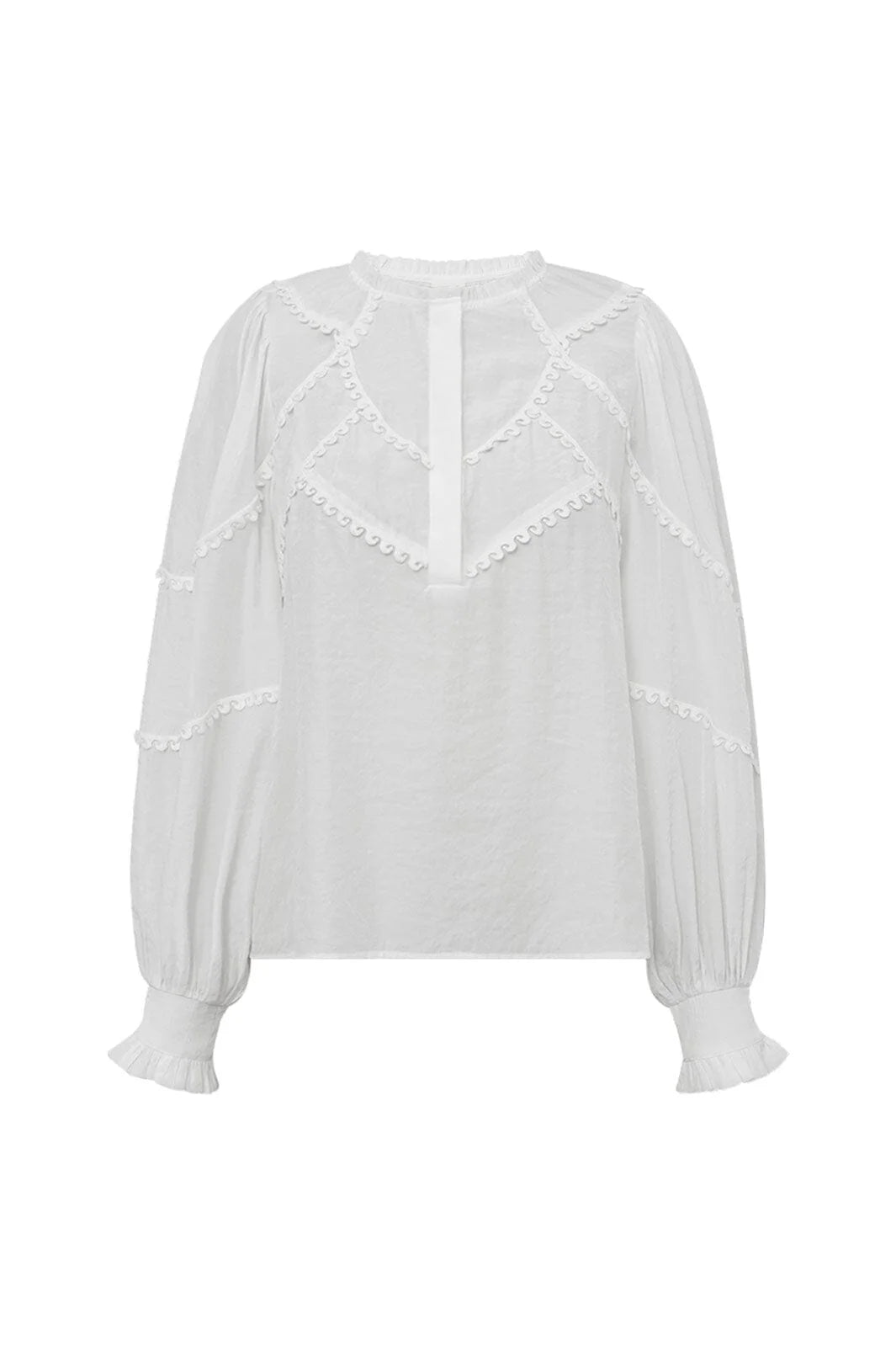 PascaleGO Blouse er en off-white bluse fra Gossia med dekorative sømmer og volanger. Blusen har en høy hals, lange ermer og en løs passform, som gjør den både praktisk og pen til hverdag og fest.