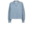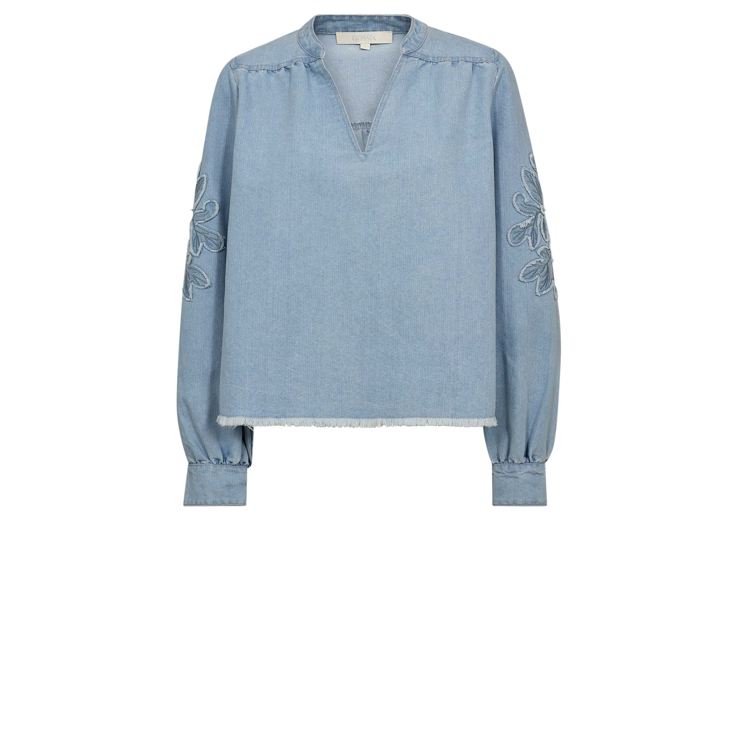 ydelig denimbluse med V-hals og mandarinkrage, designet med vakre ermer der en lett puff gir ekstra fylde og et feminint preg. Ermene er vakkert utsmykket med detaljert broderi, noe som gir blusen et eksklusivt og unikt utseende. En spesiell stil som kombinerer denims kulhet med delikate feminine detaljer.