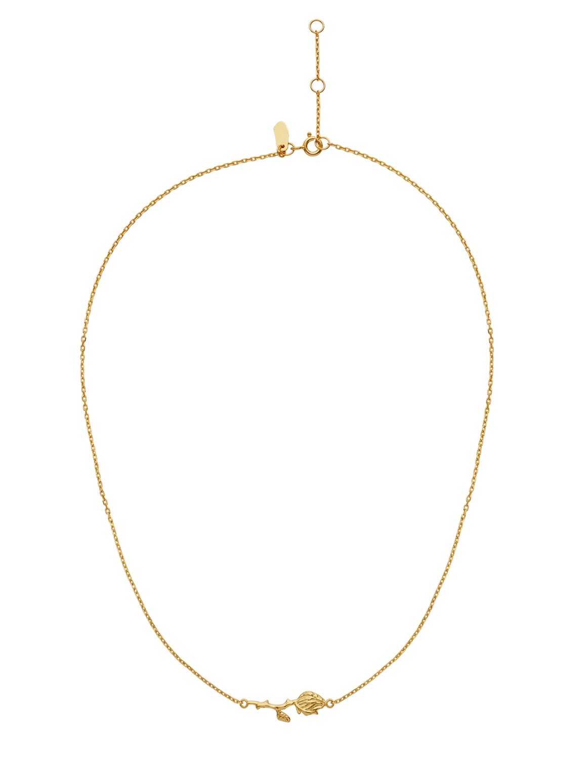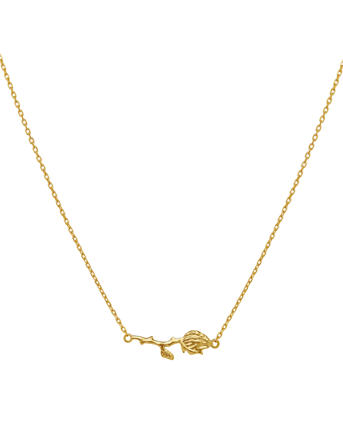 Rosanna Necklace fra Maanesten er et elegant smykke som hyller naturens enkelhet og skjønnhet. Den delikate rosen ser ut til å smelte sømløst inn i det fine kjedet, og skaper et subtilt, romantisk uttrykk. Halskjedet er laget av gullbelagt resirkulert sterlingsølv, og kombinerer håndverksmessig finesse med tidløs design. Perfekt for å tilføre et poetisk preg til ethvert antrekk.