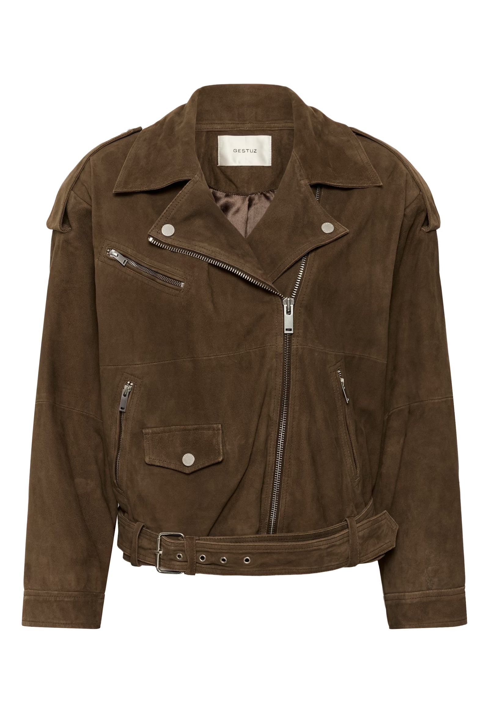 GZvida Suede Jacket Cocoa fra Gestuz er en statement bikerjakke i en matt, semsket finish. Jakken har en oversized passform med store slag, skulderstropper, asymmetrisk glidelås og et belte i livet som gir et røft og moderne uttrykk. Den hoftelange lengden gjør den enkel å style både til kjoler, jeans og dressbukser. Dette er et tidløst plagg som løfter hele antrekket.