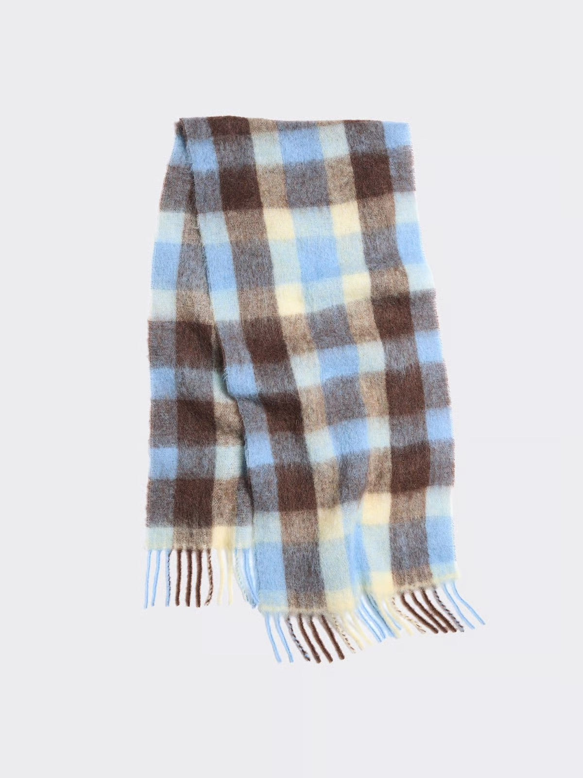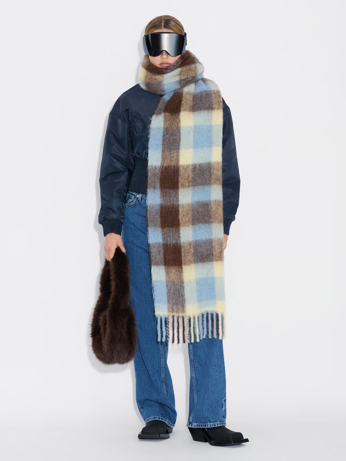 Fresia fra Holzweiler er deres klassiske, tykke og lange skjerf laget i taktil bouclé ullblanding av alpakka og mohair. Skjerfet har et rutete trykk og frynsede kanter.
