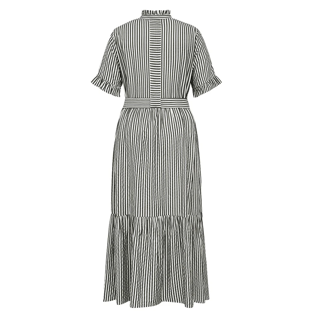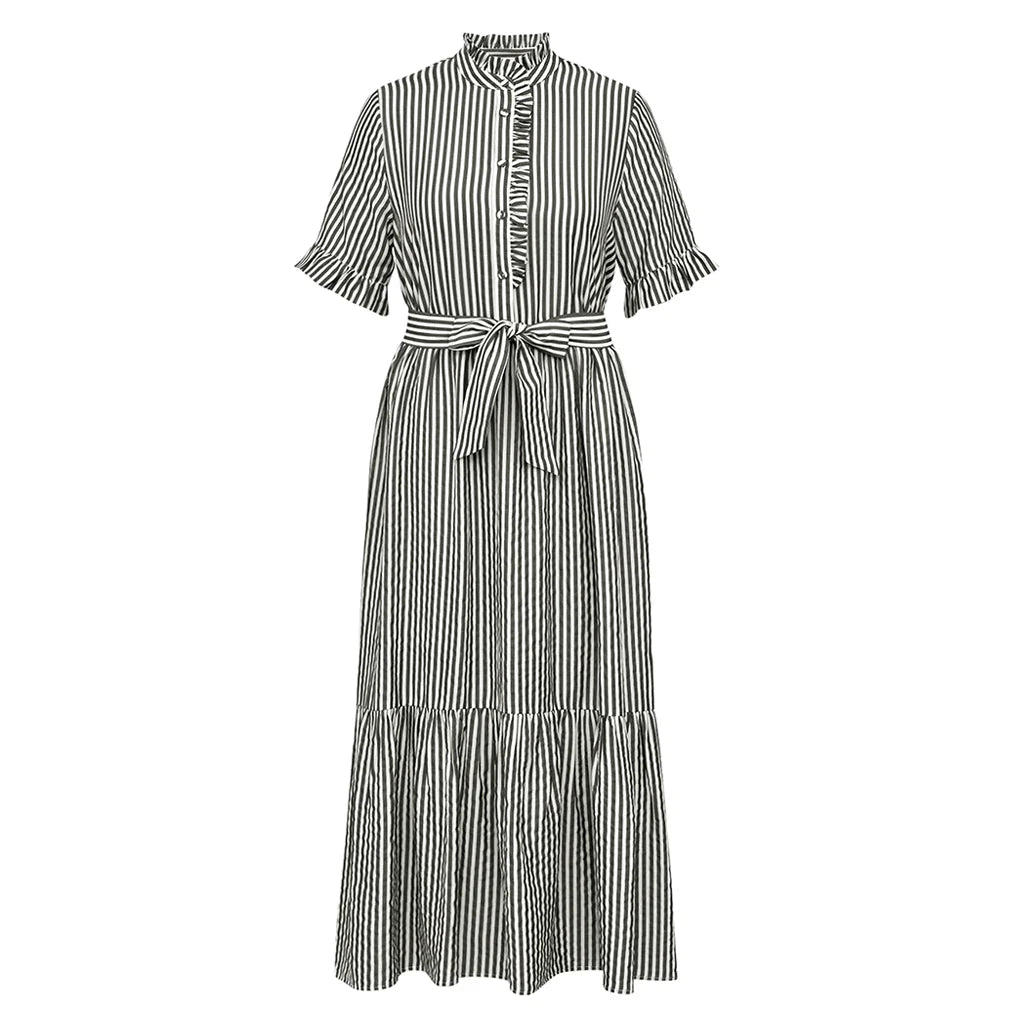 legant stripete kjole med delikate rysjedetaljer langs knappestolpen. Kjolen har knapper fra halsen til livet og en justerbar knyting i midjen for en flatterende silhuett.