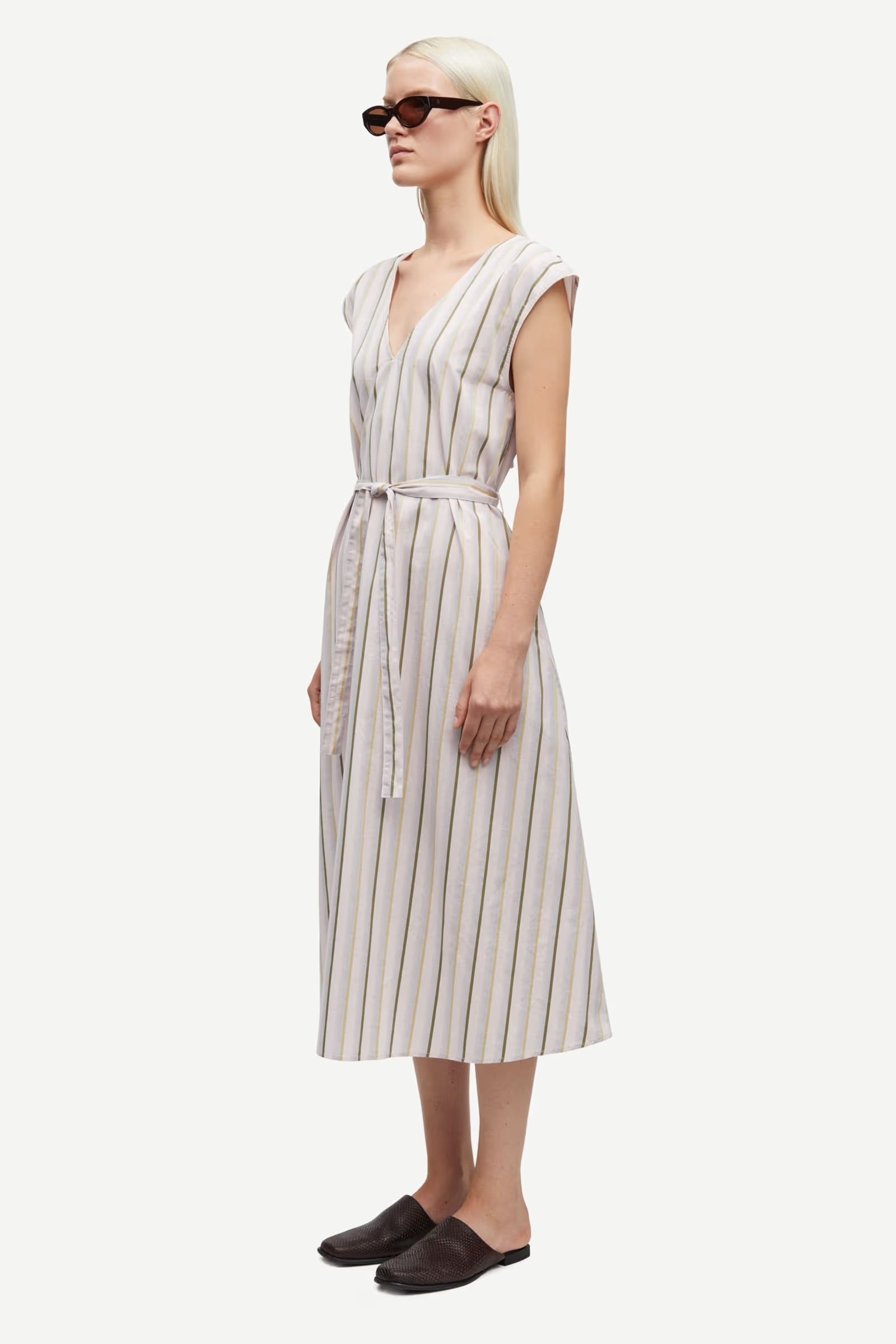 Saatrani Dress er en ermeløs midikjole med en løs og ledig passform. Kjolen har knytestropper i ryggen og knytebelte i livet for en justerbar silhuett. Med sidelommer og en dyp V-utringning kombinerer den komfort og stil. Laget av 100 % økologisk bomull – perfekt for varme dager med et bærekraftig preg.