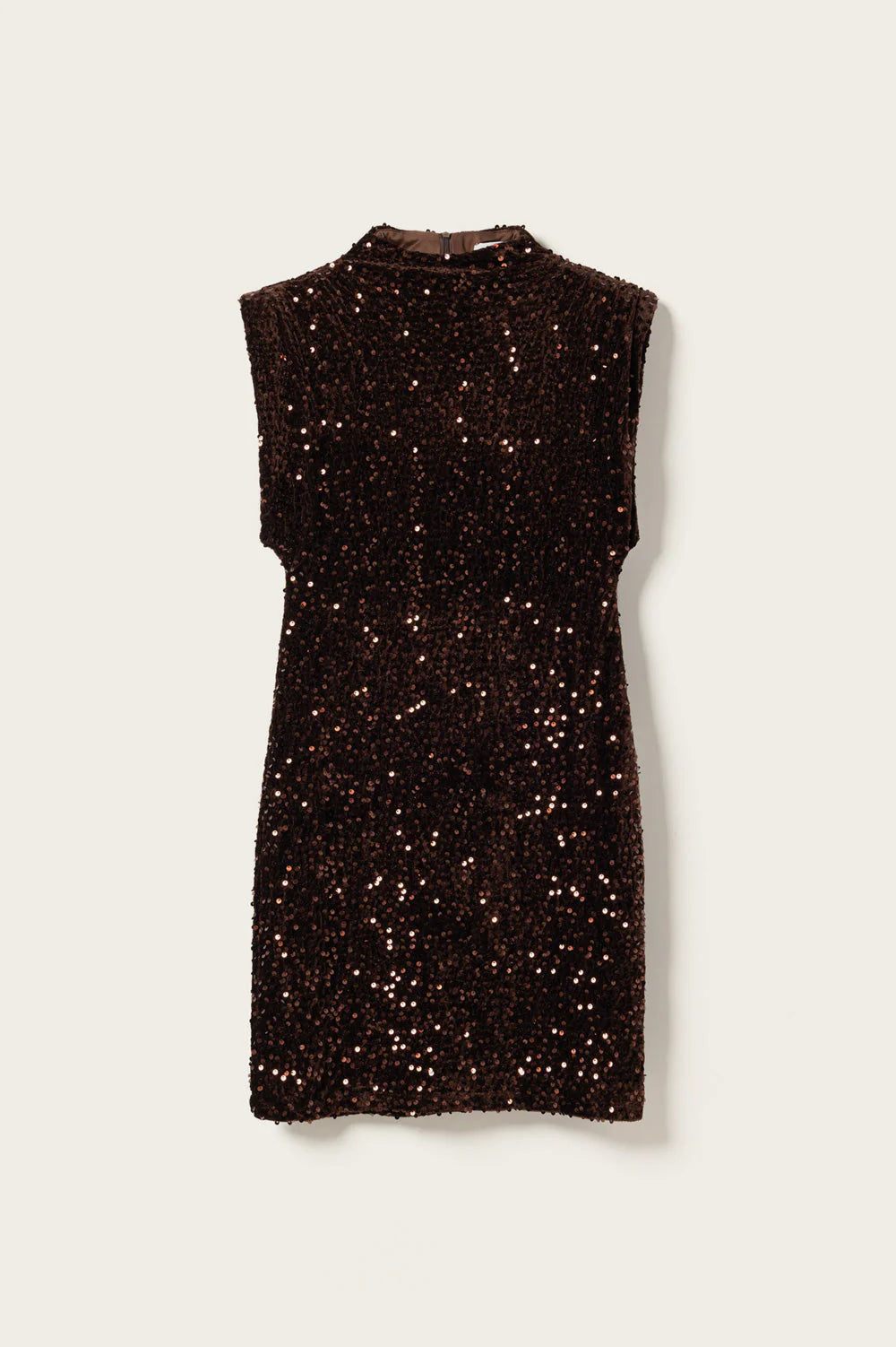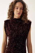 Kali Dress fra Noella er en kort kjole med høy hals og markerte skulderputer som gir en moderne silhuett. De glitrende paljettdetaljene tilfører et festlig uttrykk, mens den tettsittende midjen fremhever fasongen. Kjolen lukkes med glidelås bak og er et perfekt valg til sesongens selskaper.