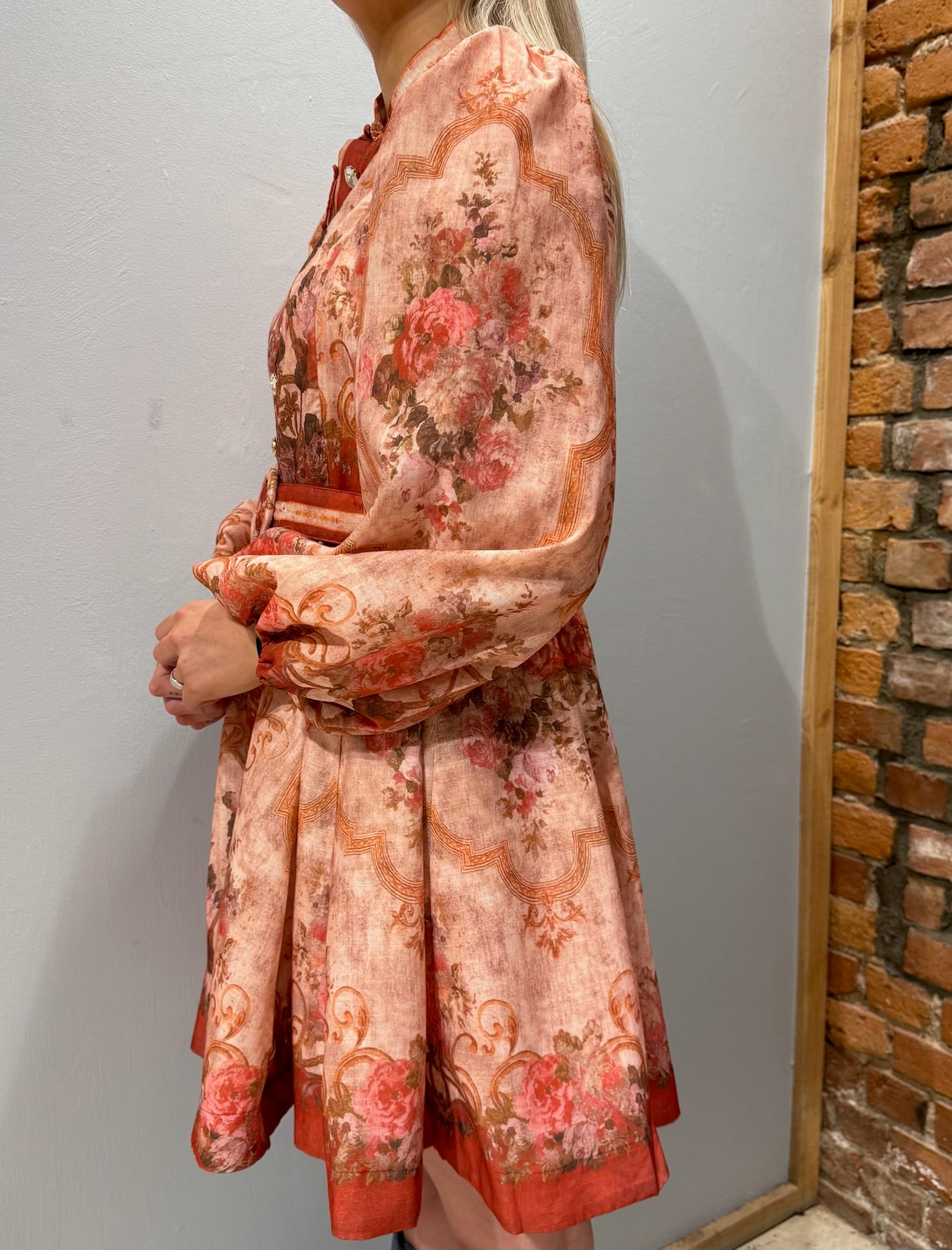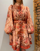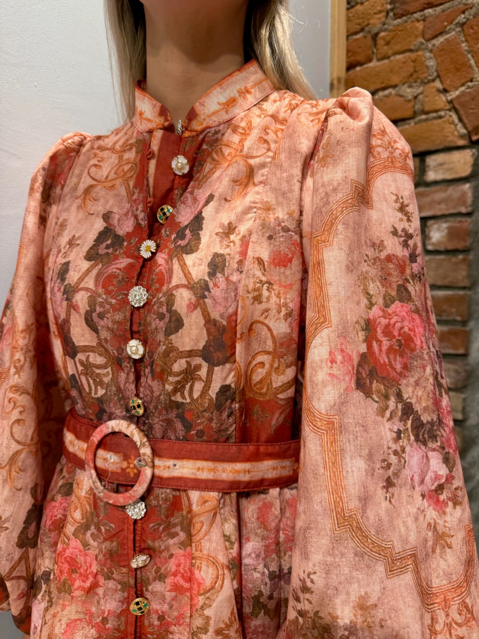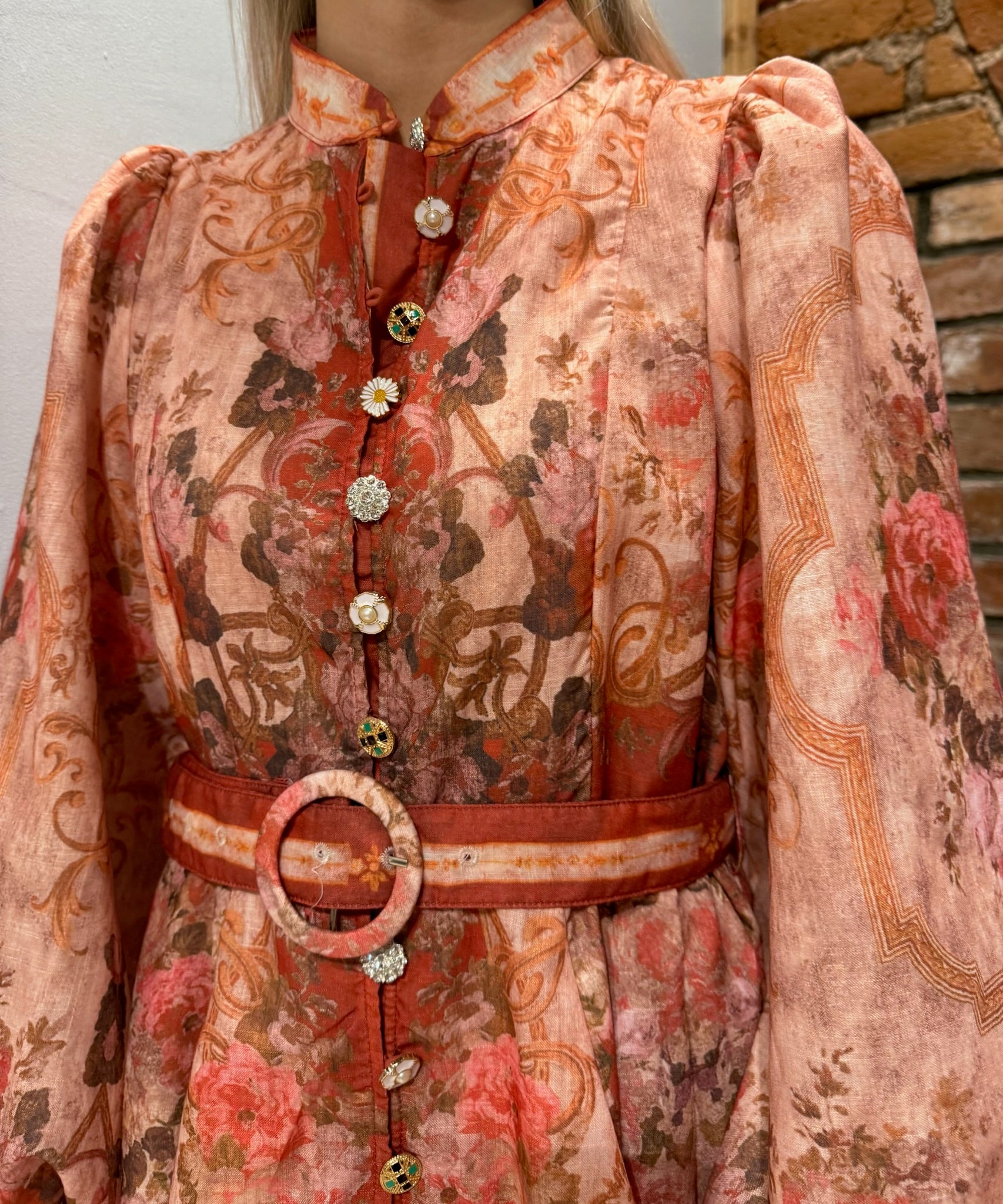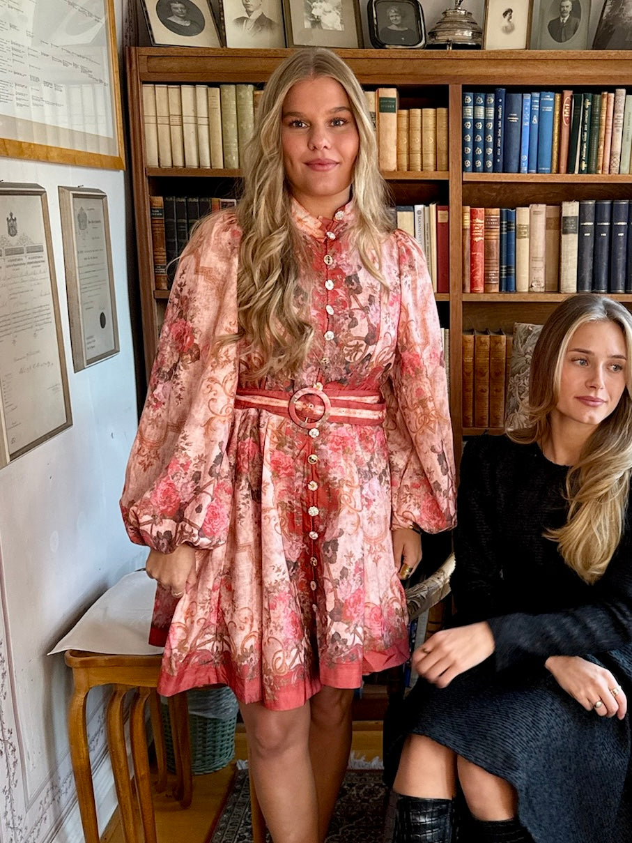 Nydelig kjole i herlig fargekombinasjon med flotte knapper i lukkingen foran. Rund hals og ange ermer som avsluttes i smal mansjett med elastikk. Belte til å smale inn.