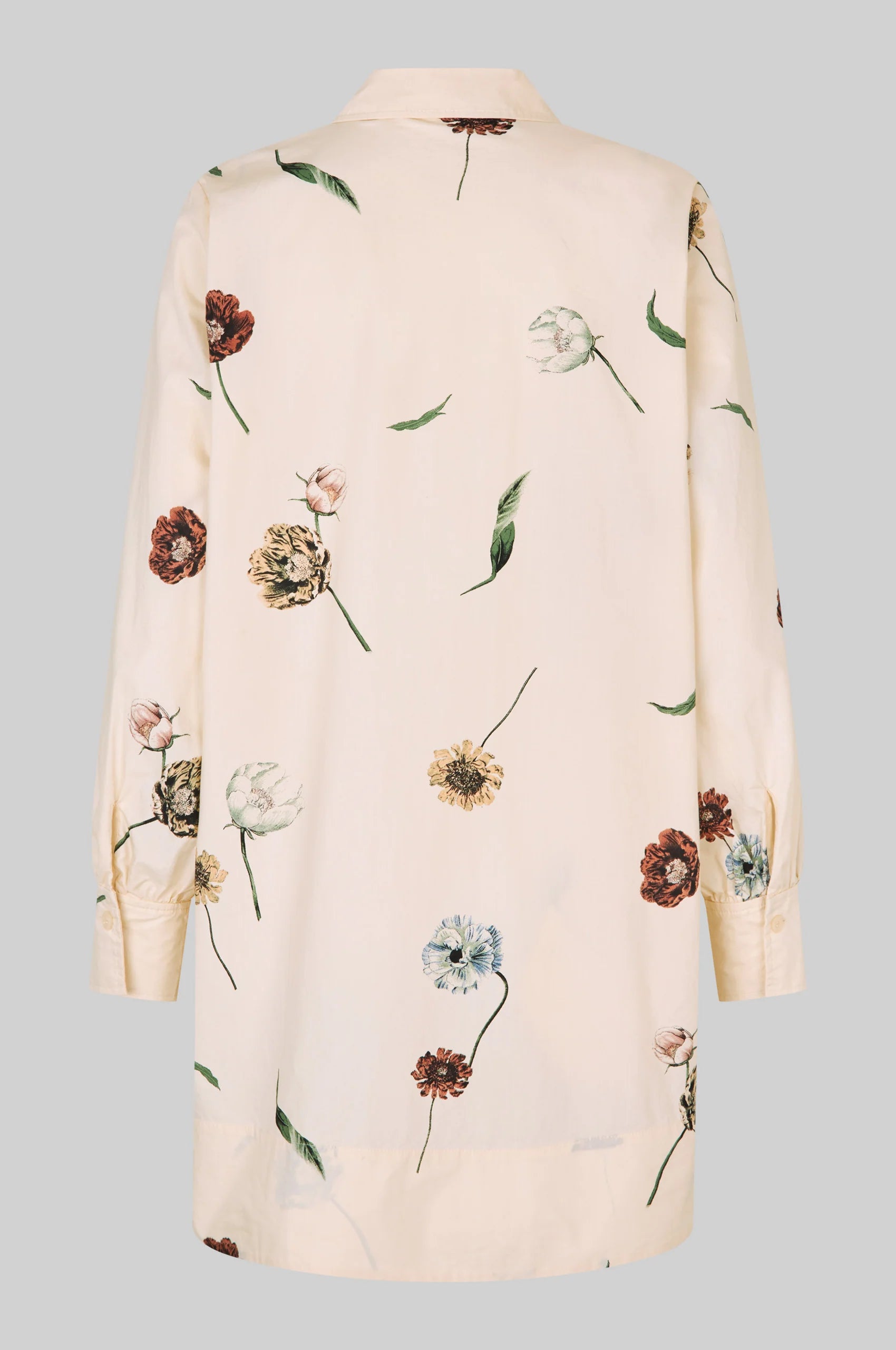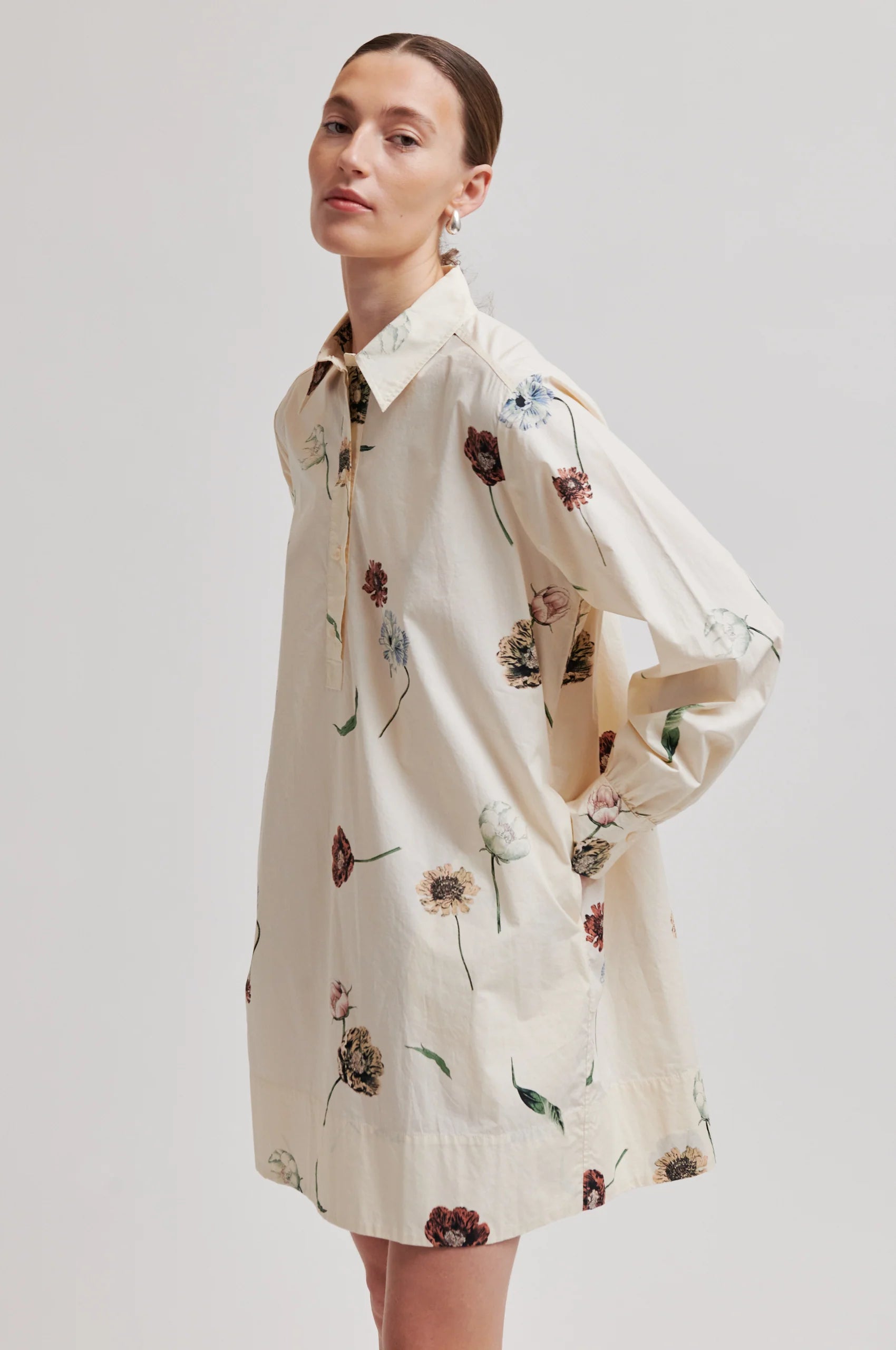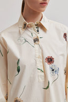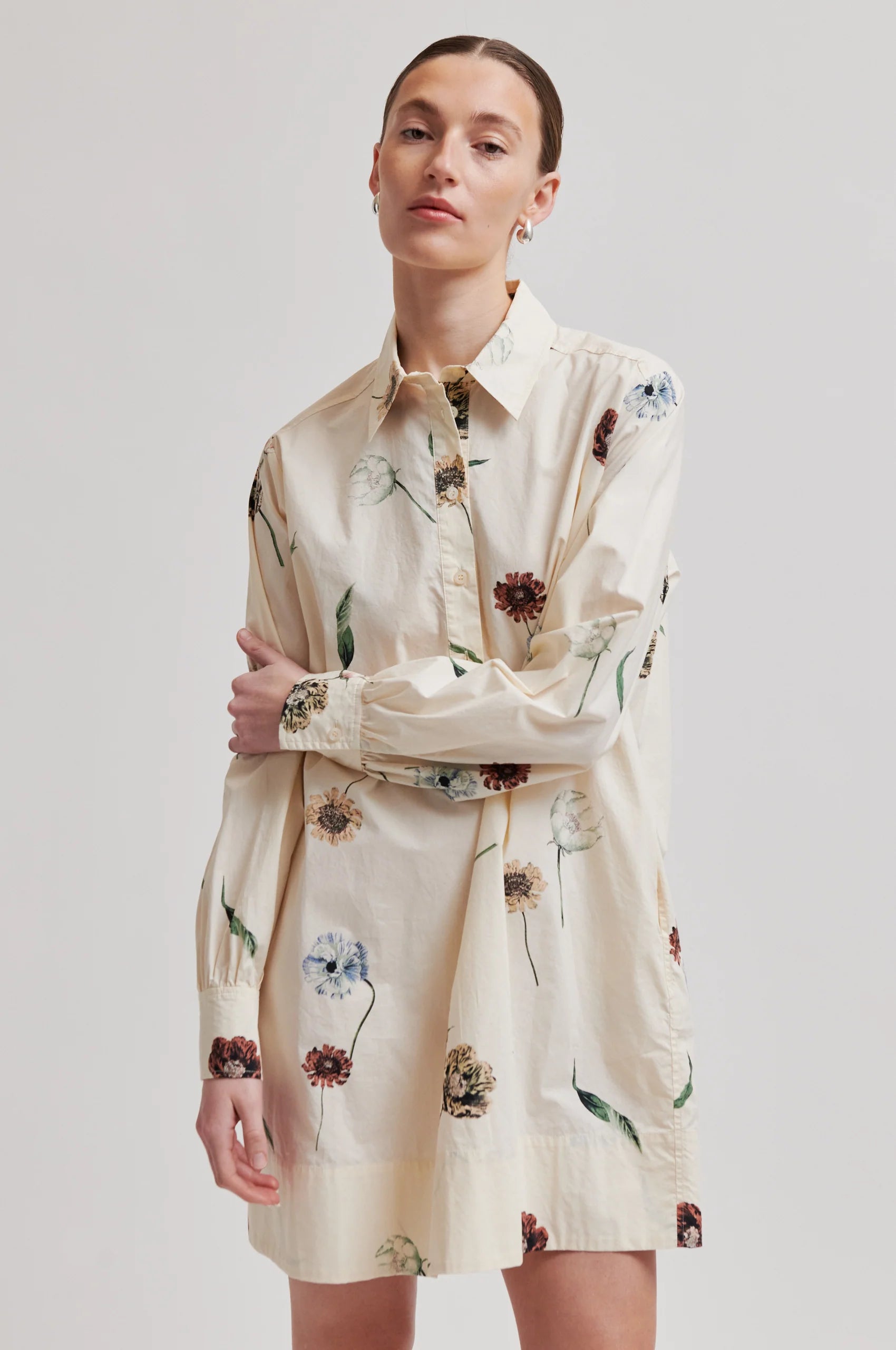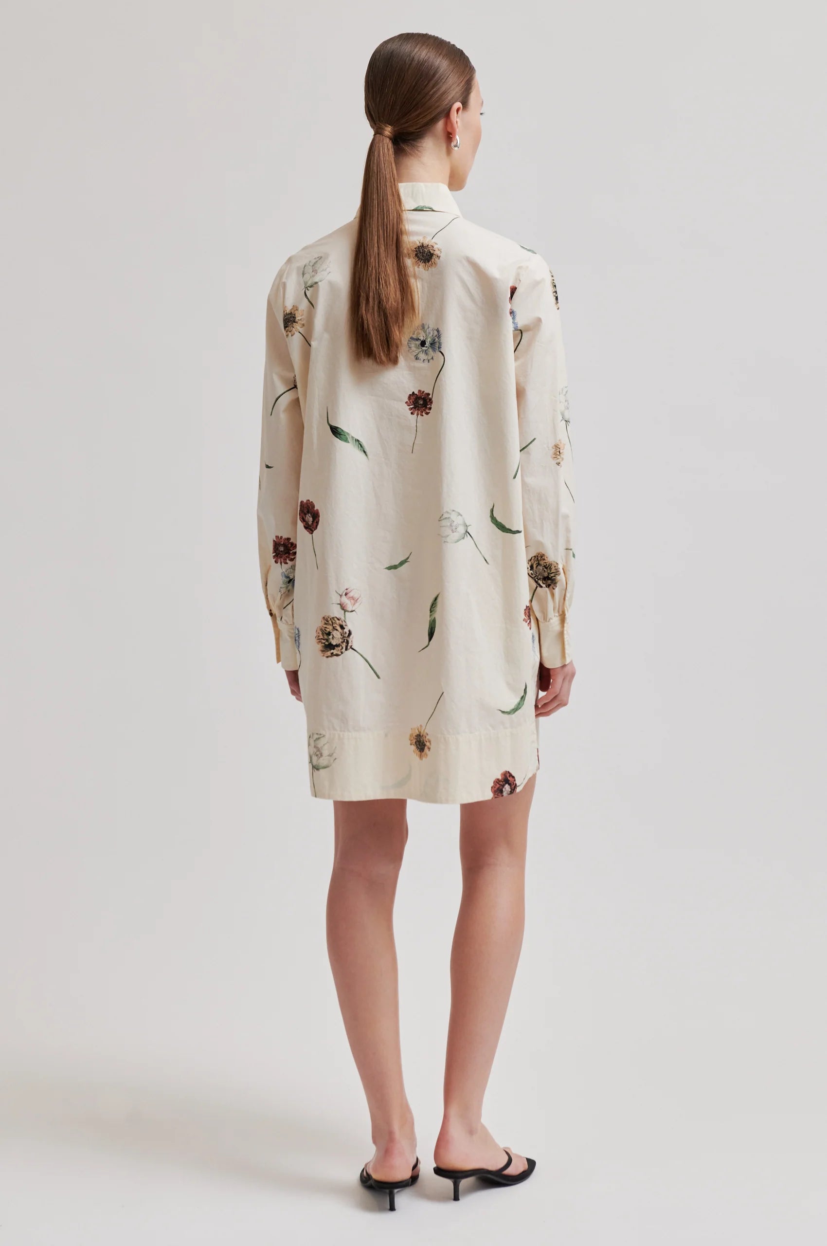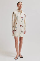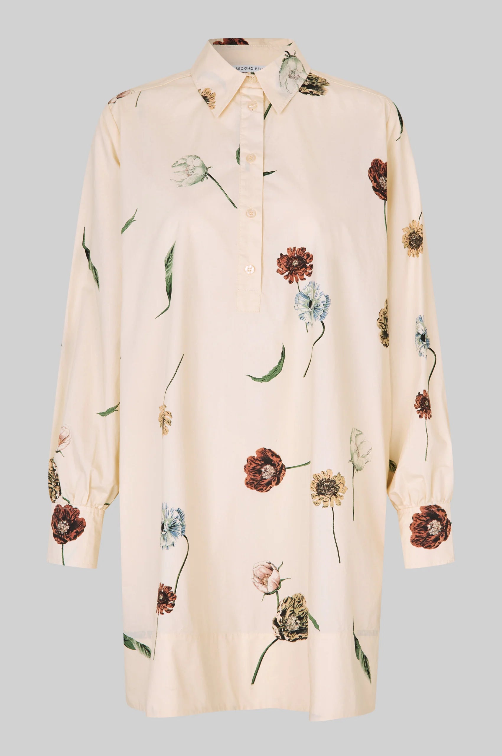 Second Female er en skjortekjole med blomstertrykk. Kjolen er laget i myk, glatt bomull. Har vanlig krage og halv stolpe med knappelukking. Lange ermer med knapper i mansjettene. Bred kant nederst. Rett, avslappet passform.