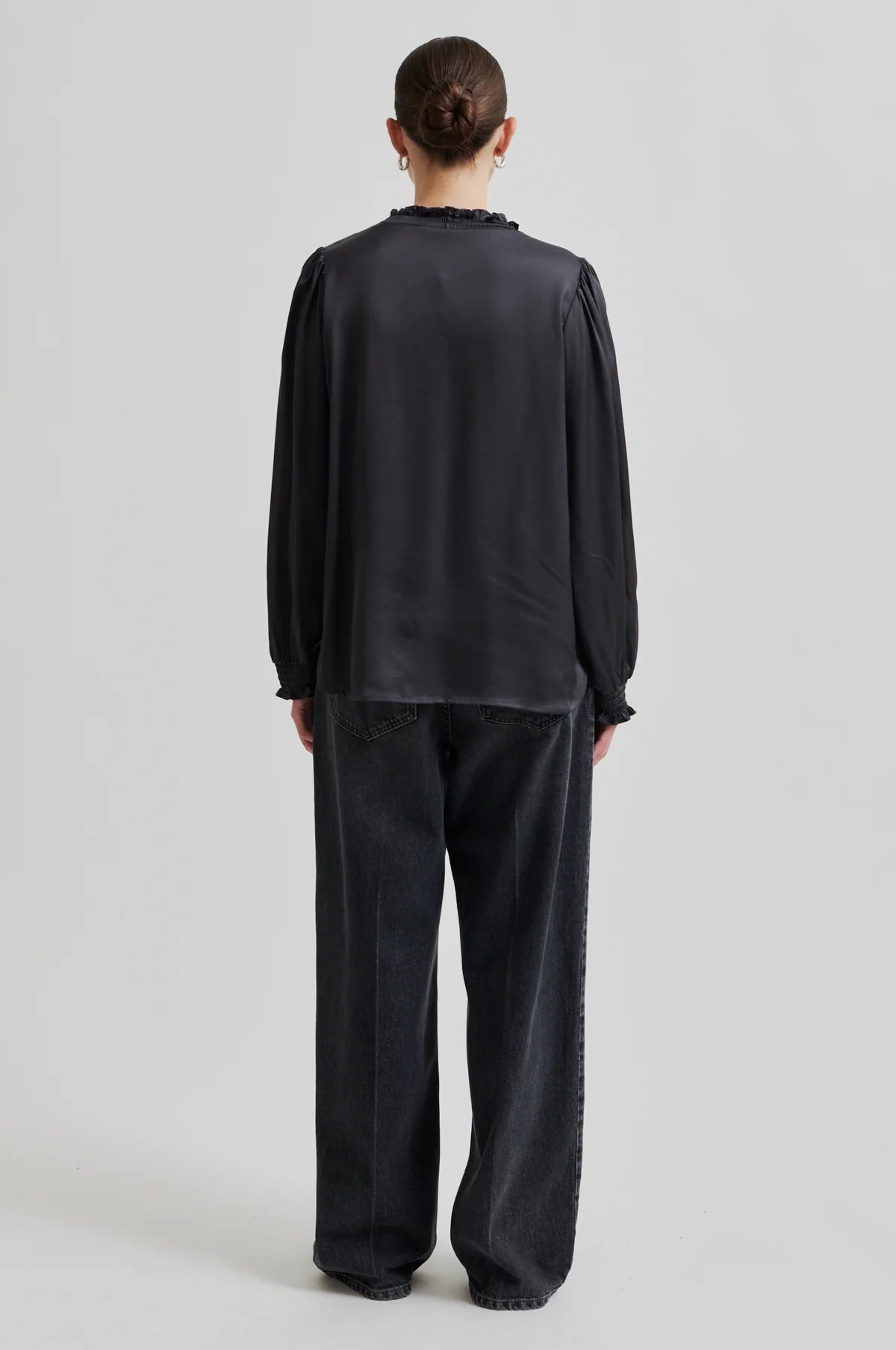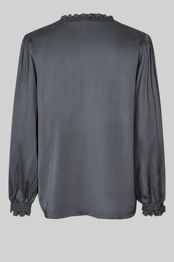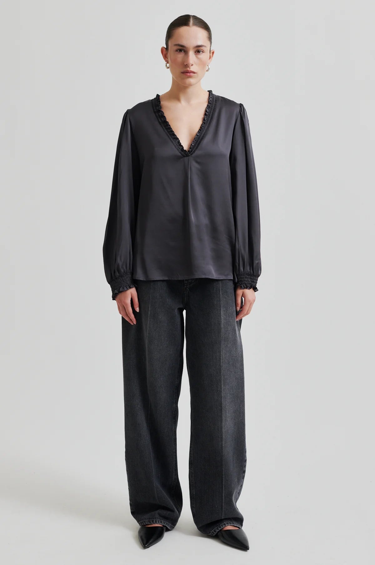 Bardi V-Neck Blouse fra Second Female er en bluse med frillkant. Laget i myk og silkeaktig viskose med drapert kvalitet. Med V-halskrage med volangkant og omvendt fold foran. Rynkede skuldre og lange ermer med elastiske mansjetter med liten volangkant i endene. Løs, flytende passform.