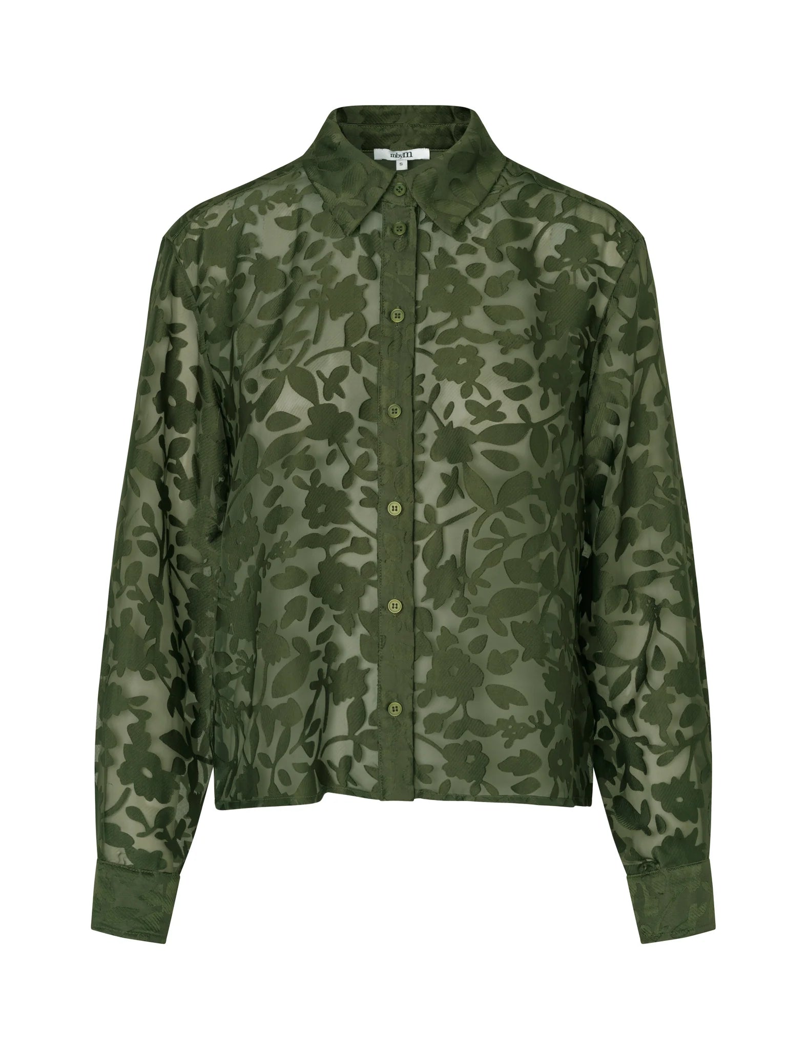 Nira-M Tiami Shirt/Blouse Beetle Green fra mbyM er en elegant skjortebluse med gjennomskinnelig blomstermønster som gir et feminint uttrykk. Den har knappelukking foran, lange ermer og en flatterende passform som passer både til hverdags og fest.
