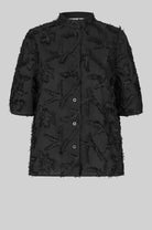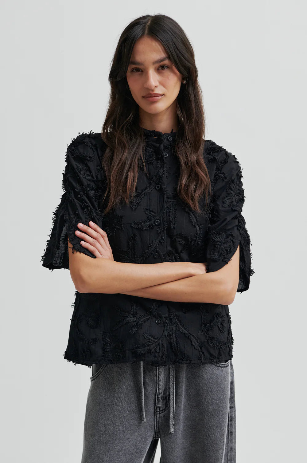 Seena SS Shirt Black fra Second Female er en kortermet skjorte laget i en myk bomullsblanding med et vakkert 3D-strukturert bladmønster. Skjorten har rund krage, knappelukking foran og korte ermer med elastisk rynkedetalj. Passformen er rett og normal, et elegant og moderne plagg som kombinerer struktur med feminin letthet.
