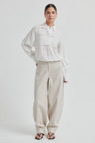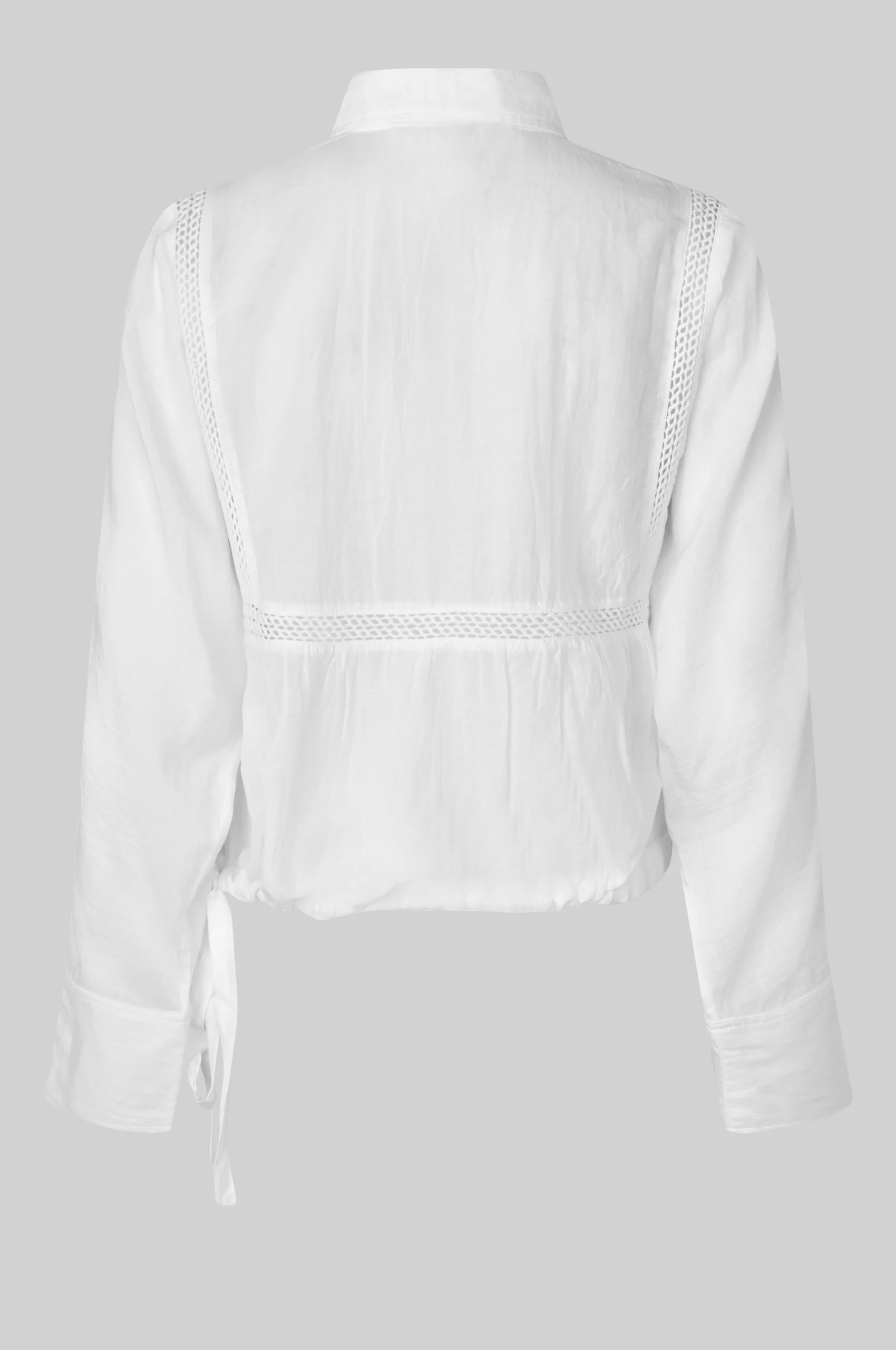 Second Female er en bluse med blondedetaljer. Skjorten er laget i glatt bomullsblanding med blondedetaljer. Har krage med halv stolpe og skjulte knapper. Mansjetter med knapper og snøring nederst. Løs passform som kan justeres.